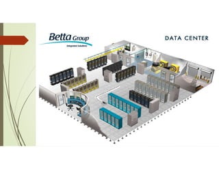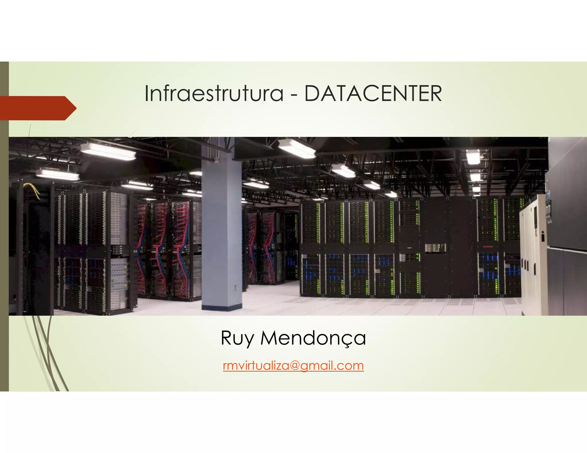O documento discute os principais aspectos relacionados a datacenters, incluindo o que são datacenters e seus tipos, serviços oferecidos, critérios para seleção de local e tendências futuras. Os principais pontos são: datacenters centralizam equipamentos de TI para garantir segurança e disponibilidade dos dados; existem datacenters privados e públicos; serviços incluem hospedagem, co-location e hosting; critérios como acesso a energia, telecomunicações e riscos devem ser considerados na escolha do local.