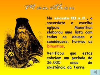 O documento descreve como as estimativas da idade da Terra evoluíram ao longo dos séculos, desde 36.000 anos segundo Manethon no século III a.C. até centenas de milhões de anos no século XX, à medida que novos métodos científicos foram desenvolvidos.