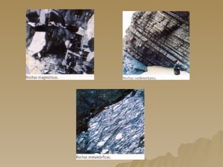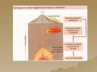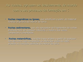 O documento discute os métodos de datação de rochas, incluindo suas características, origens e classificações. Aborda rochas sedimentares, magmáticas e metamórficas, além dos princípios de sobreposição de estratos e correlação paleontológica para determinar a idade relativa das rochas. Também menciona métodos de datação absoluta como radiometria.