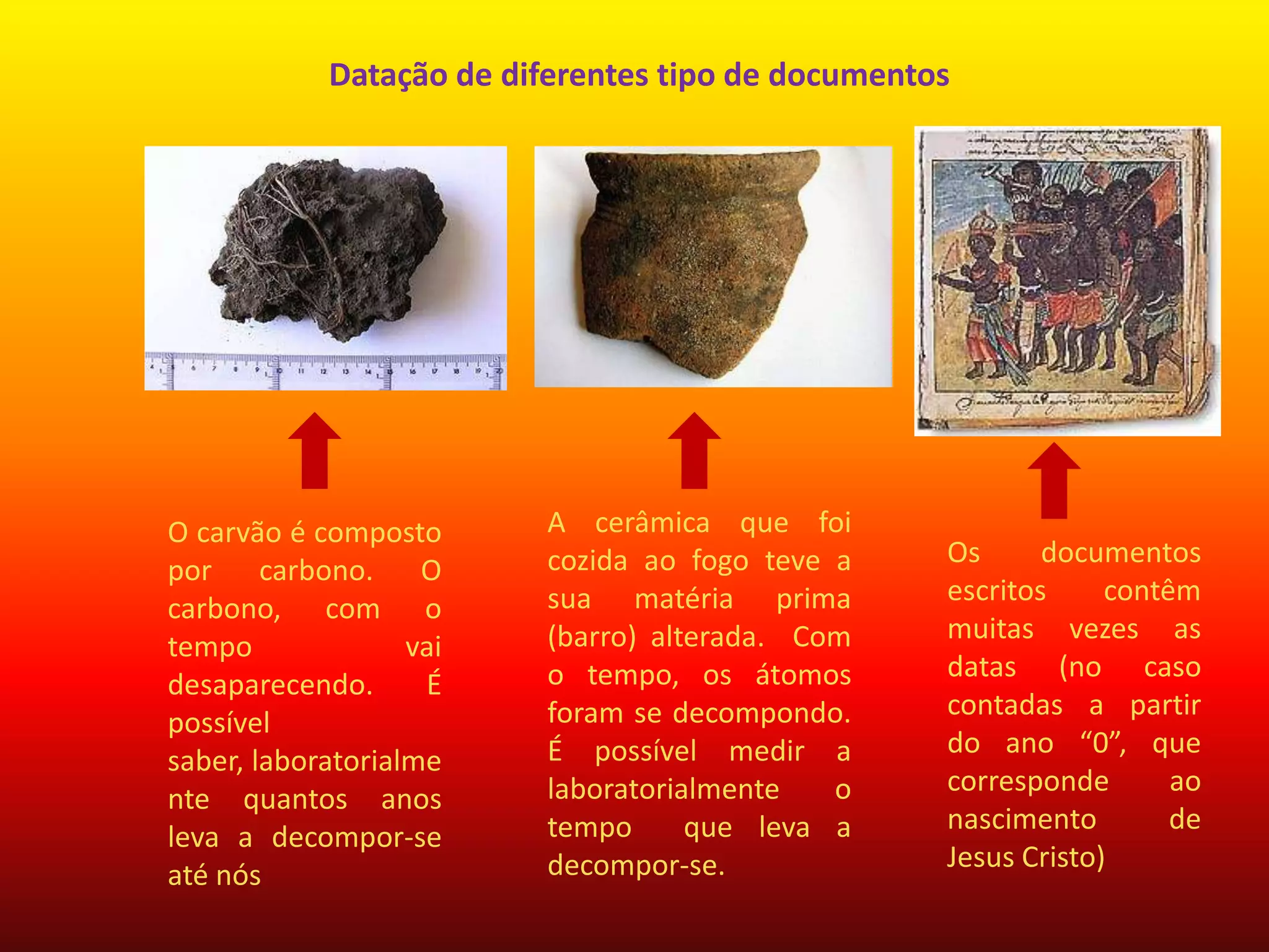Os documentos escritos contêm datas que permitem datá-los. A cerâmica pode ser datada medindo a decomposição da matéria-prima sob o efeito do tempo. O carvão também pode ser datado pela decomposição do carbono ao longo dos anos.