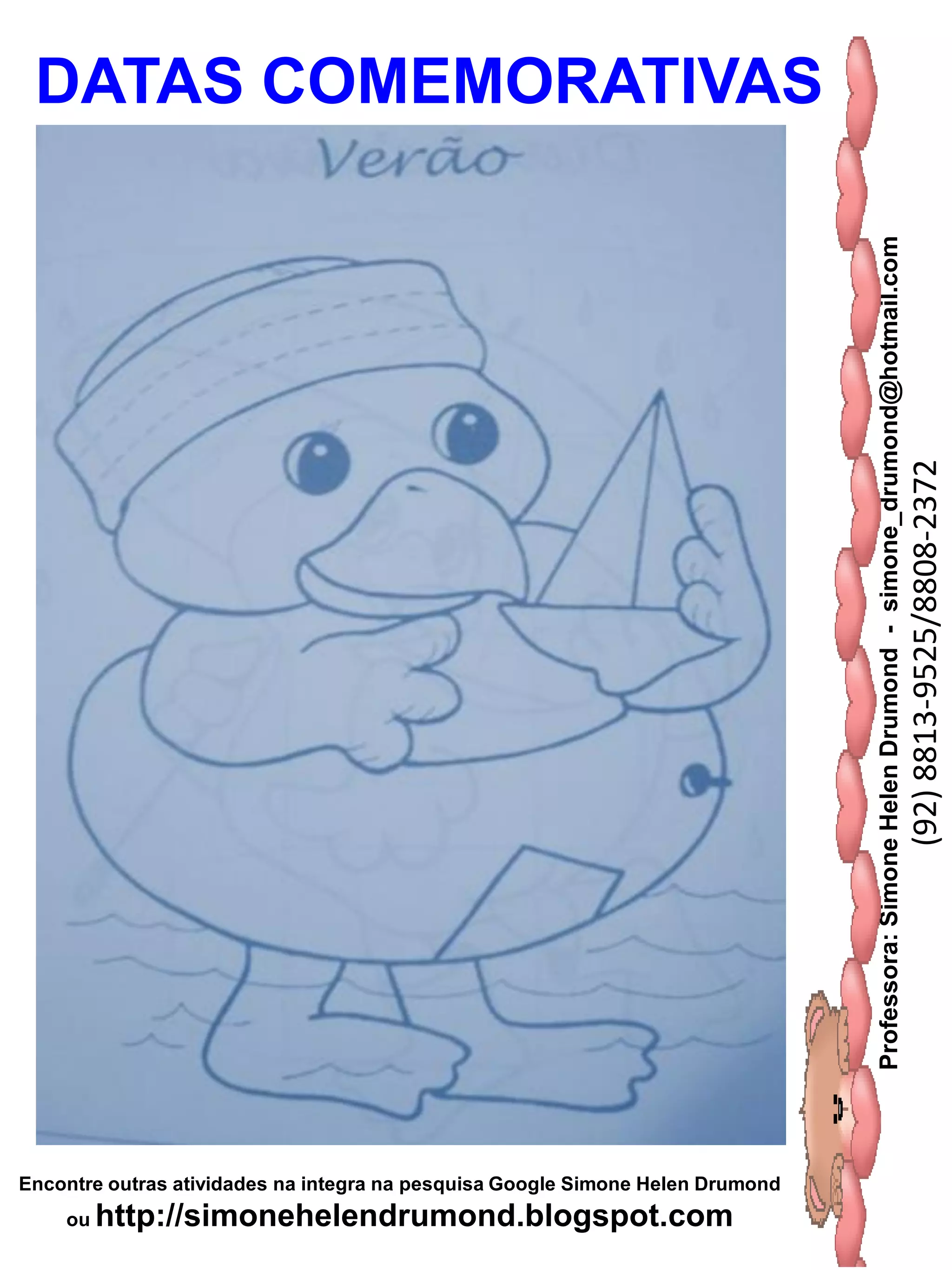 O documento fornece os contatos da professora Simone Helen Drumond, incluindo e-mail e números de telefone, e instruições para encontrar outras atividades dela online ou em seu blog, que discute datas comemorativas.