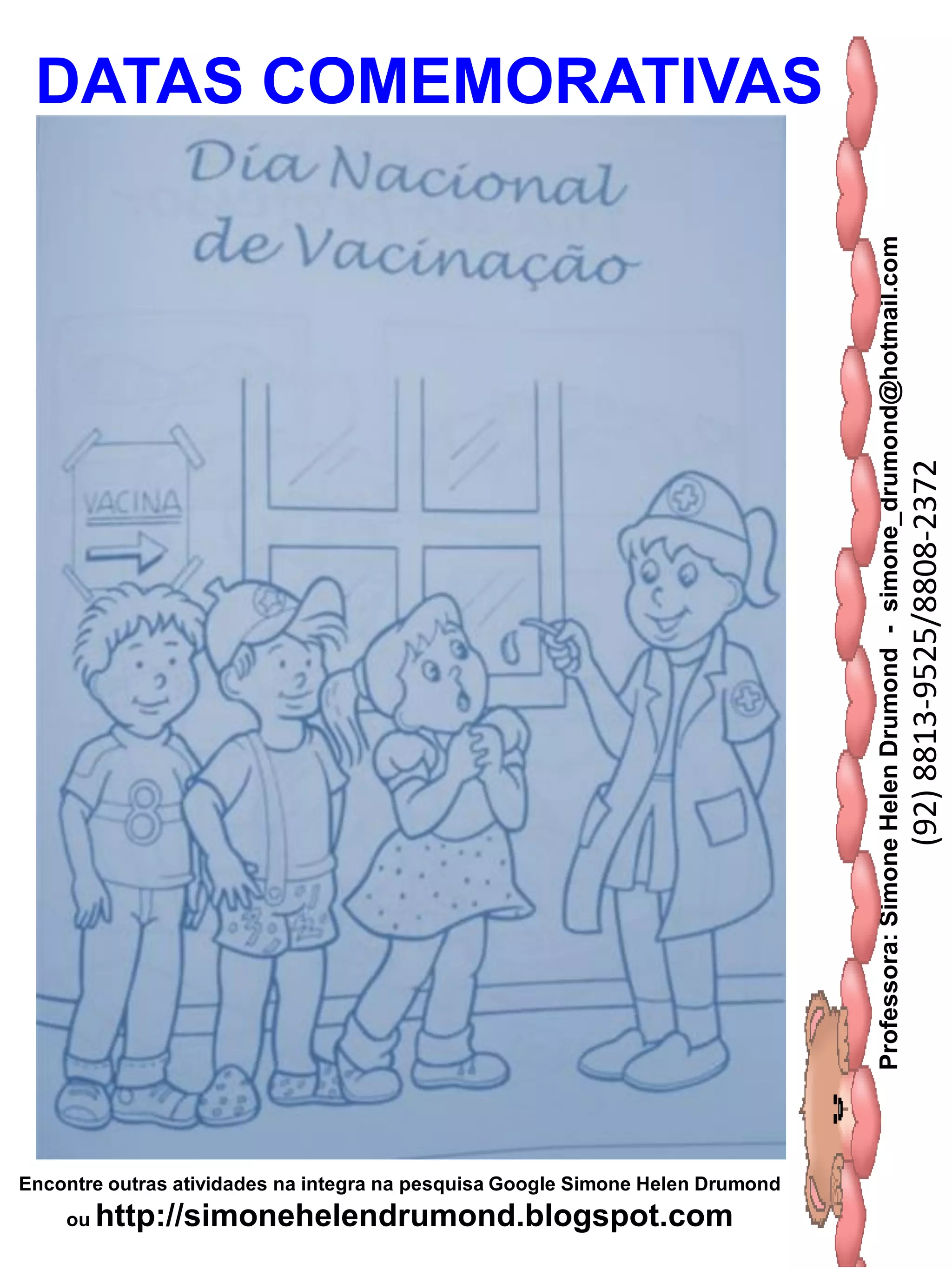 O documento fornece os contatos da professora Simone Helen Drumond, incluindo seu e-mail e números de telefone, e instruições para encontrar outras atividades dela no Google e em seu blog, que discute datas comemorativas.