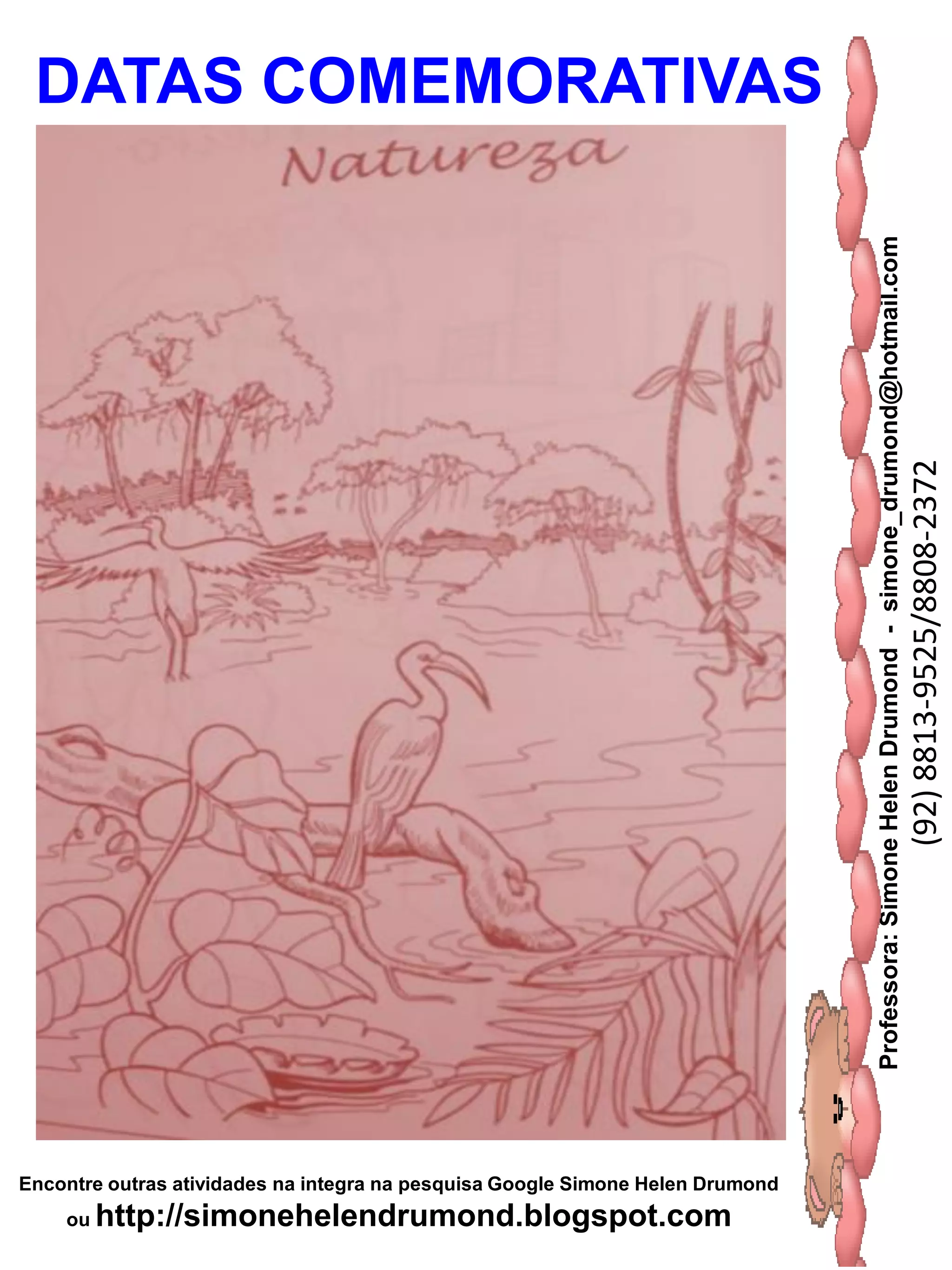 O documento fornece os contatos da professora Simone Helen Drumond, incluindo seu e-mail e números de telefone, e informa onde encontrar outras atividades relacionadas a datas comemorativas em seu blog ou pesquisando seu nome no Google.