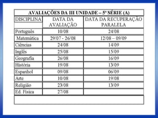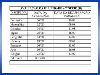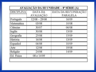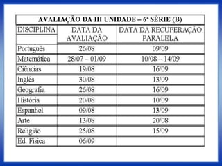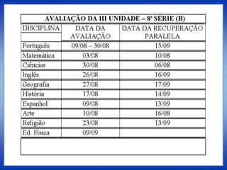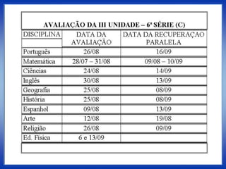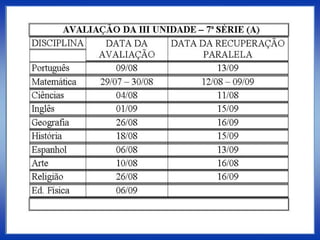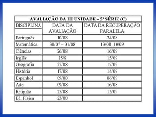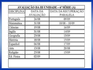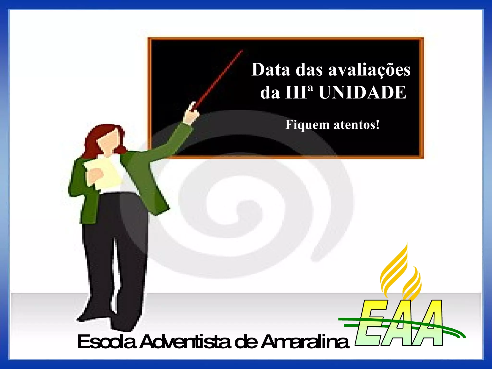 As avaliações da IIIa unidade da Escola Adventista de Amaralina serão realizadas nas seguintes datas: de 15 a 18 de novembro para o ensino fundamental anos iniciais e de 22 a 25 de novembro para o ensino fundamental anos finais.
