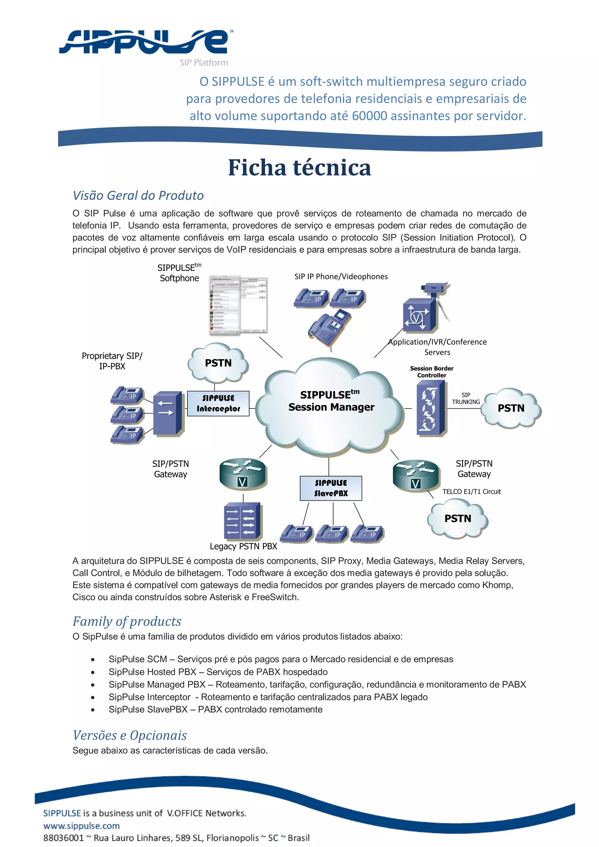 O documento descreve o SIPPULSE, um softswitch projetado para provedores de telefonia que suporta até 60.000 assinantes. Ele fornece serviços de comutação de pacotes de voz usando o protocolo SIP em larga escala. O SIPPULSE oferece vários produtos como SCM para serviços pré e pós-pagos e Hosted PBX para serviços de PABX hospedados.