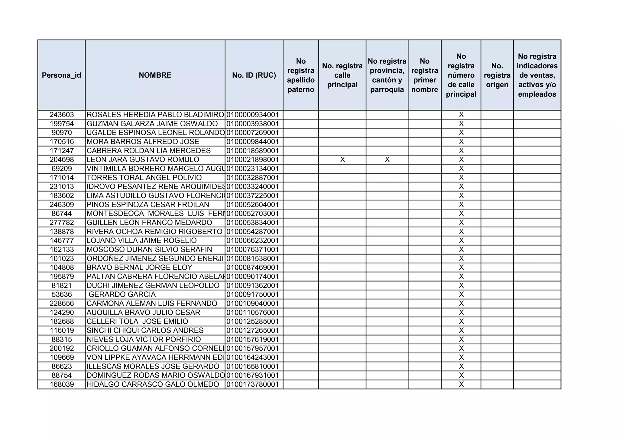 Persona_id NOMBRE No. ID (RUC) calle número registra de ventas,