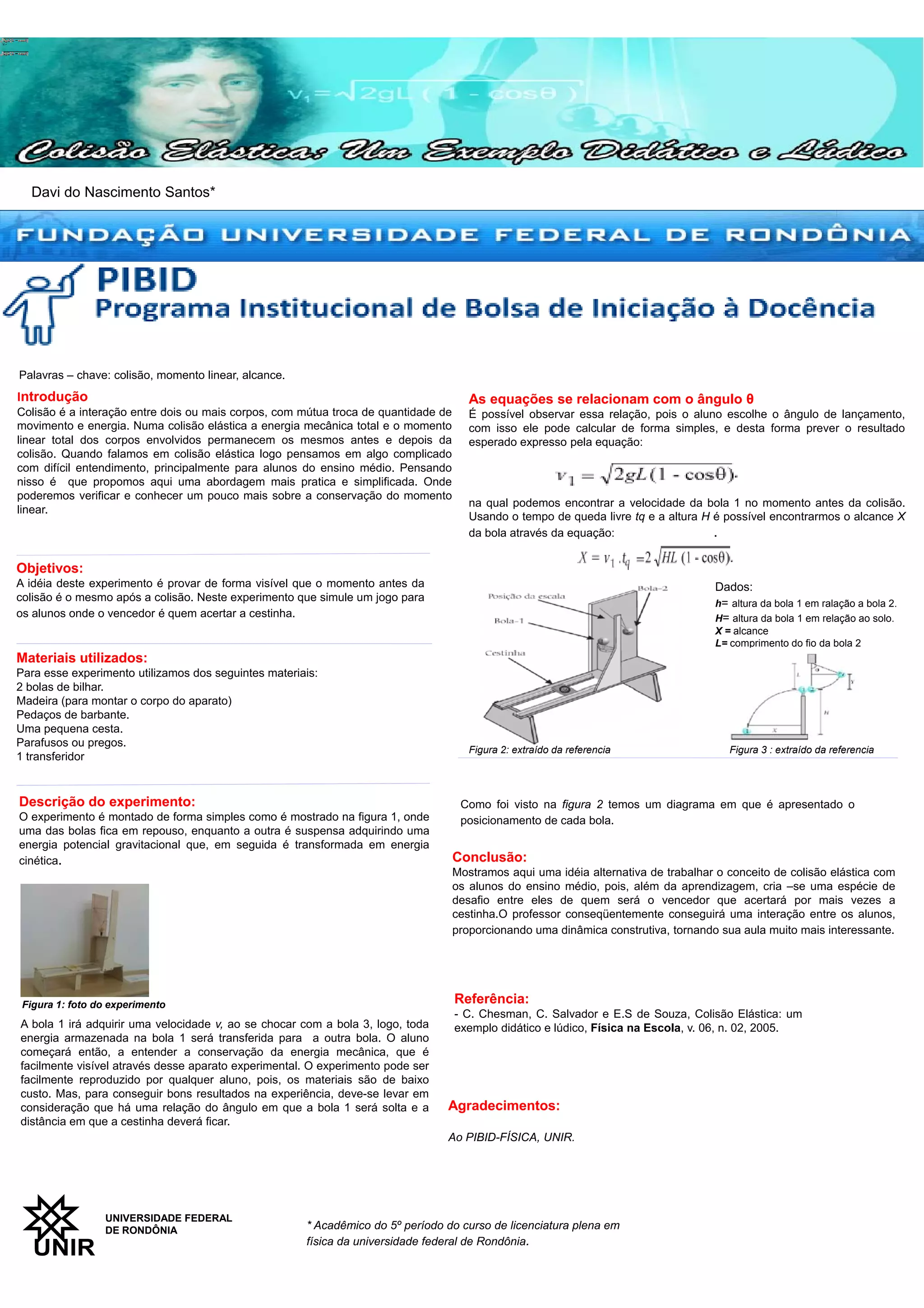 Este documento descreve um experimento simples para ensinar conservação do momento linear em colisões elásticas para estudantes do ensino médio. O experimento envolve suspender uma bola acima de outra bola em repouso e uma cesta, de modo que quando a primeira bola é liberada, ela colide com a segunda bola e ambas se movem em direção à cesta. As equações para velocidade e alcance são fornecidas para analisar os resultados do experimento.