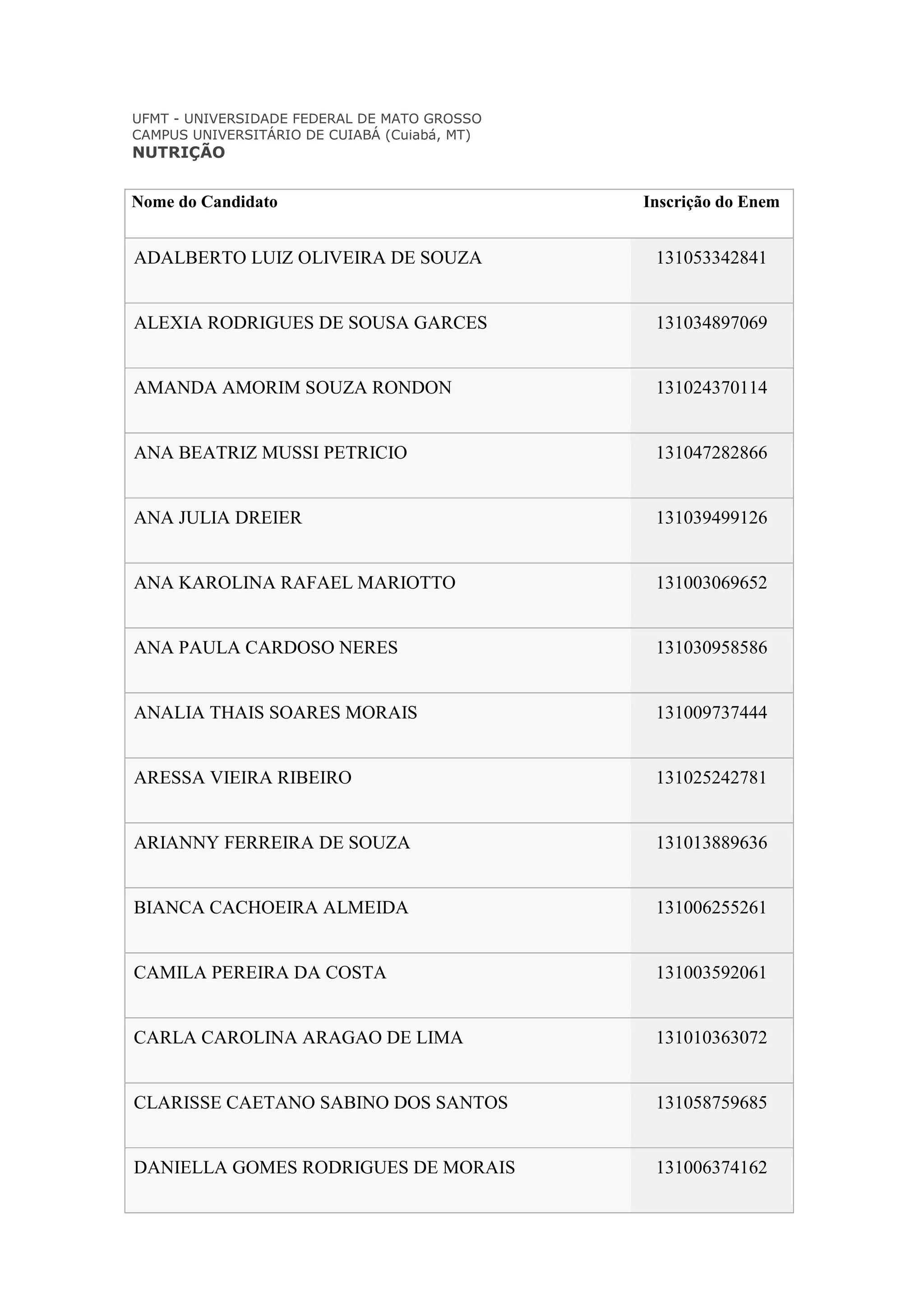O documento lista os nomes dos candidatos inscritos no curso de Nutrição da Universidade Federal de Mato Grosso no Campus de Cuiabá. A lista contém 47 nomes de candidatos inscritos no Enem.