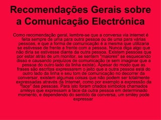 O documento fornece recomendações sobre comunicação online, incluindo usar a mesma cortesia que em conversas cara a cara, usar símbolos como smileys para expressar emoções, e seguir boas práticas ao usar e-mail e bate-papos online.