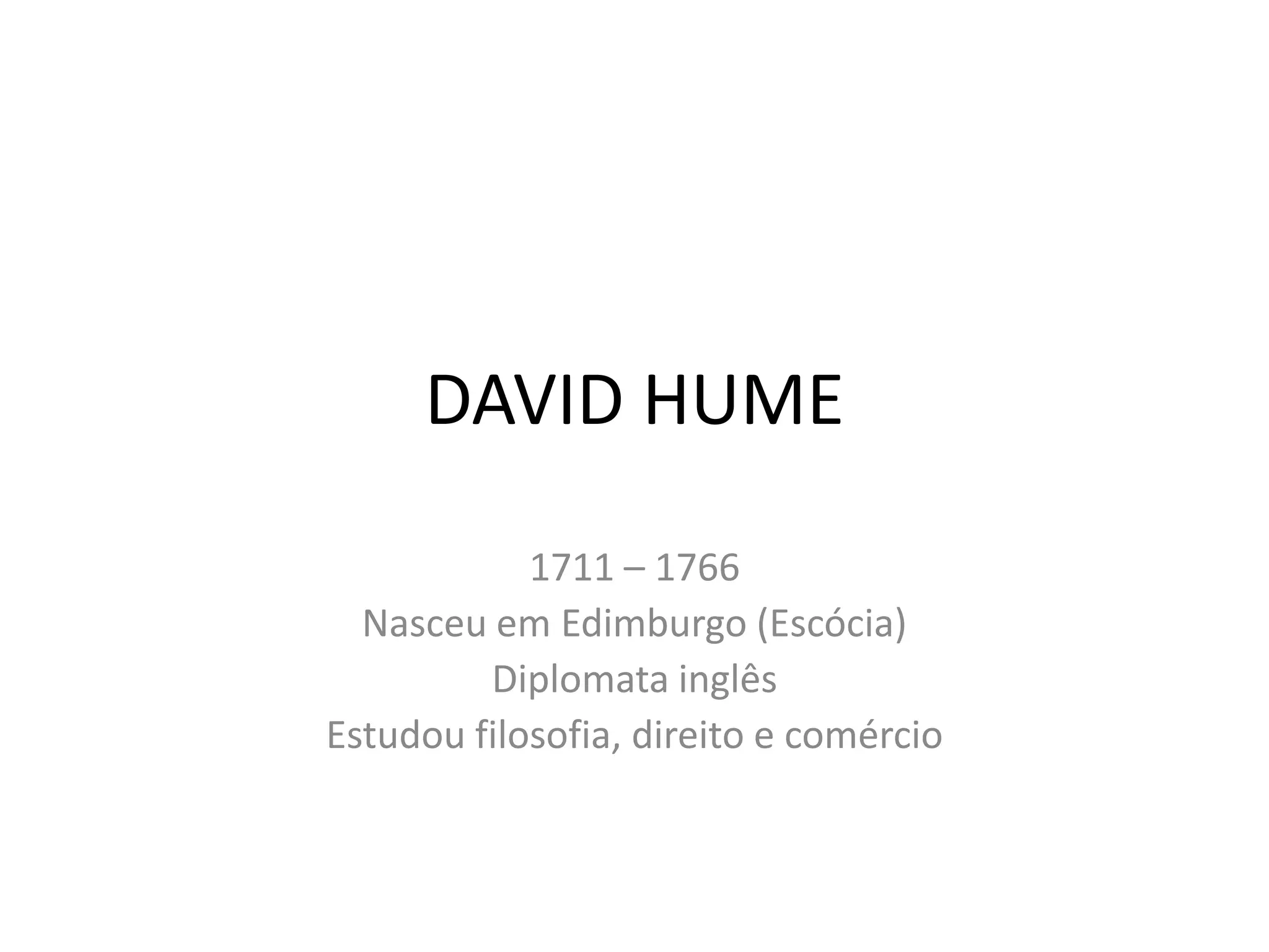 David Hume (1711-1766) foi um filósofo e historiador escocês. Ele estudou filosofia, direito e comércio e escreveu obras importantes como Tratado sobre a natureza humana e Ensaios sobre o intelecto humano que apresentaram suas teorias empiristas sobre o conhecimento e a moral. Hume argumentou que todo conhecimento vem da experiência sensorial e que a indução e crenças morais são baseadas em sentimentos e não na razão.