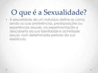 O documento discute a sexualidade humana e o desenvolvimento sexual na adolescência, incluindo a puberdade e os caracteres sexuais que se desenvolvem em rapazes e raparigas. Também aborda tópicos como gravidez na adolescência, taxas de gravidez em Portugal e no mundo, e métodos contraceptivos.