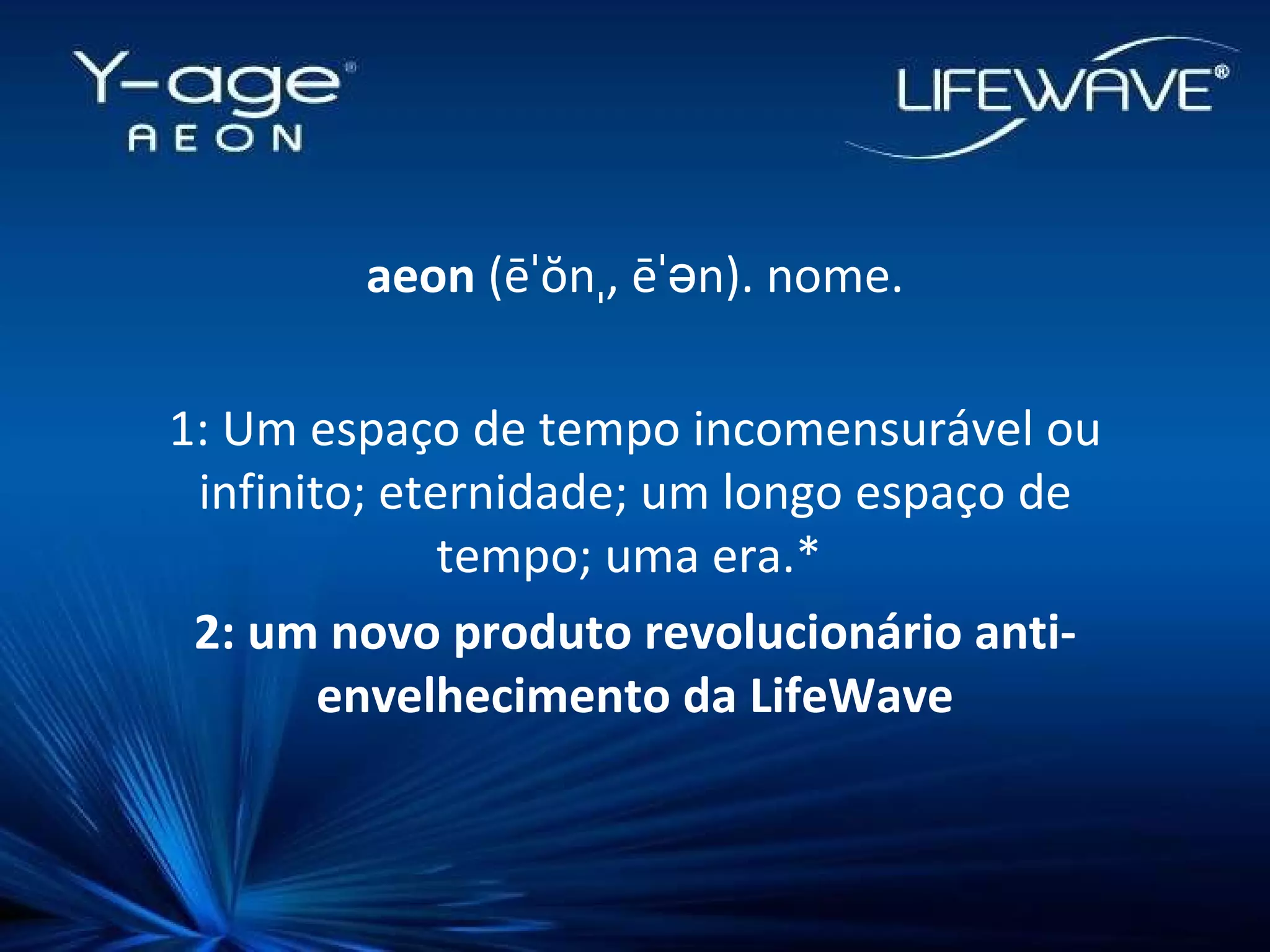 O documento discute o processo de envelhecimento e como o novo produto Aeon da LifeWave pode ajudar a combatê-lo através de três mecanismos: 1) reduzir o estresse no corpo, 2) reduzir a inflamação, e 3) proteger e recuperar o DNA para um estado mais jovem.