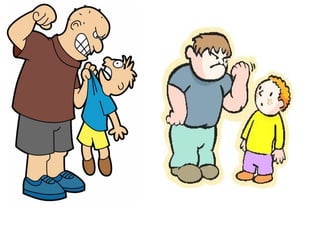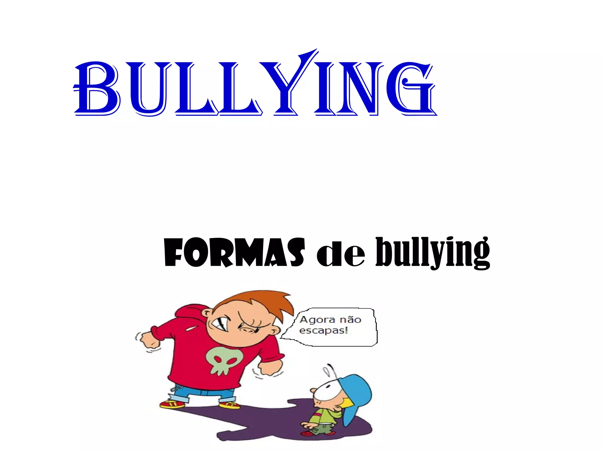 O documento descreve três formas de bullying: agressão física, que envolve violência e força excessiva contra outras pessoas; bullying psicológico, que busca humilhar a vítima; e ciberbullying, uma forma de assédio online destinada a humilhar a vítima.