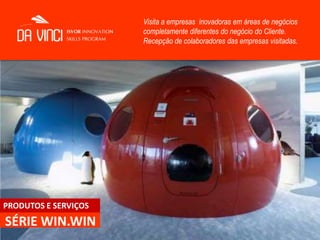 O documento discute como desenvolver a capacidade de inovação nas pessoas por meio do programa "Da Vinci". O programa oferece diversos cursos, palestras e oficinas com foco em sete competências essenciais para lidar com a complexidade, além de inspirar as pessoas a pensar de forma mais criativa por meio da arte e ambientes estimulantes. O objetivo final é capacitar stakeholders para inovar e lidar com mudanças constantes.