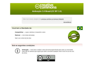 O documento discute os Recursos Educacionais Abertos (REA), que são materiais licenciados que permitem o uso, adaptação e compartilhamento, promovendo a educação inclusiva e colaborativa. Destaca a importância da autoria docente e do reconhecimento dos alunos como criadores, além de abordar licenças Creative Commons que possibilitam diferentes formas de compartilhamento. A gestão de propriedade intelectual é apresentada como uma forma de equilibrar direitos autorais e o acesso ao conhecimento.