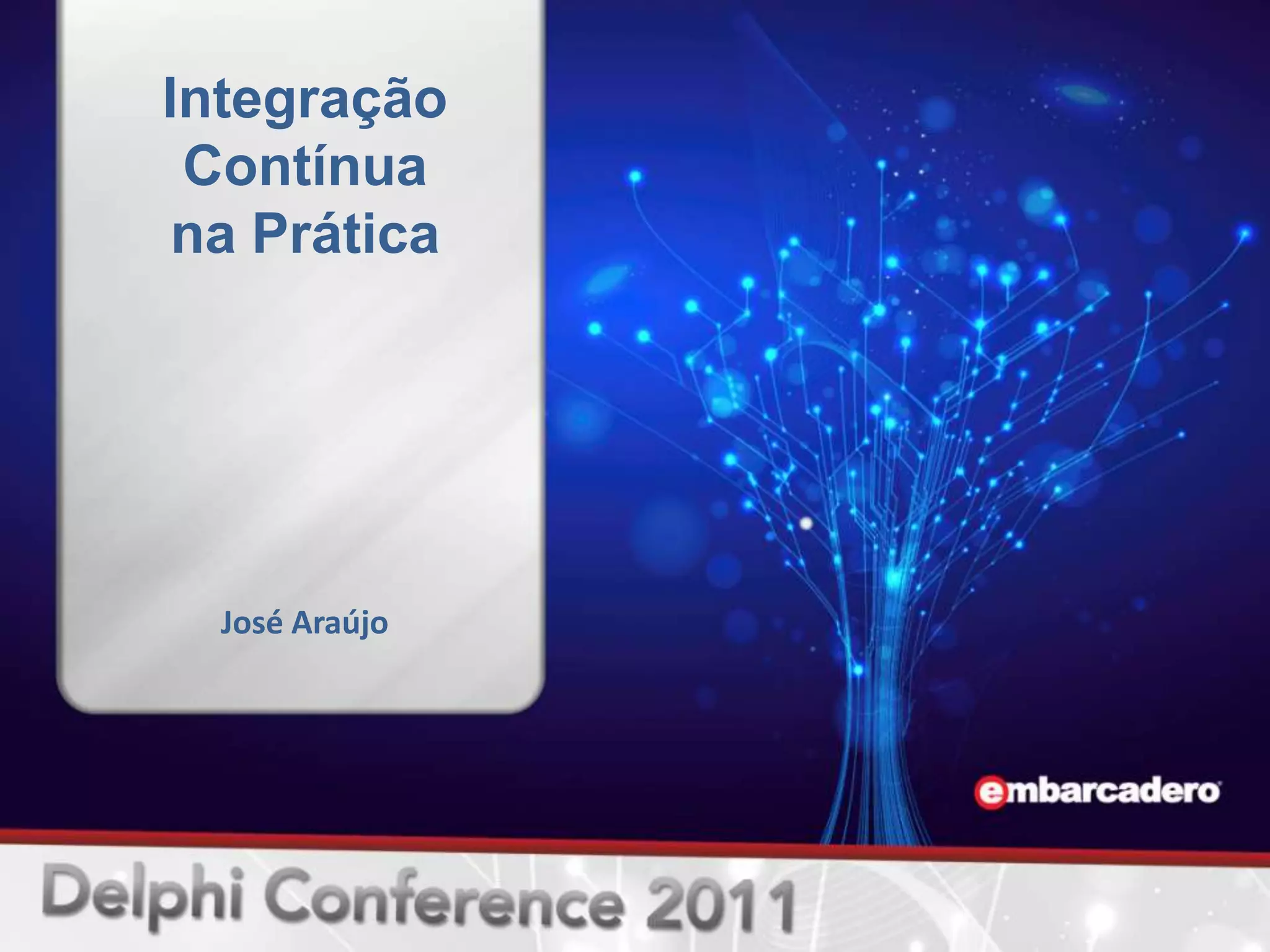 O documento discute a integração contínua na prática, apresentando José Araújo como palestrante com experiência em engenharia de software. A integração contínua é um processo onde os desenvolvedores integram frequentemente seu código no repositório principal, permitindo que testes automatizados sejam executados a cada alteração para fornecer feedback rápido e confiança coletiva no código. O documento também fornece detalhes sobre o fluxo de trabalho de integração contínua.