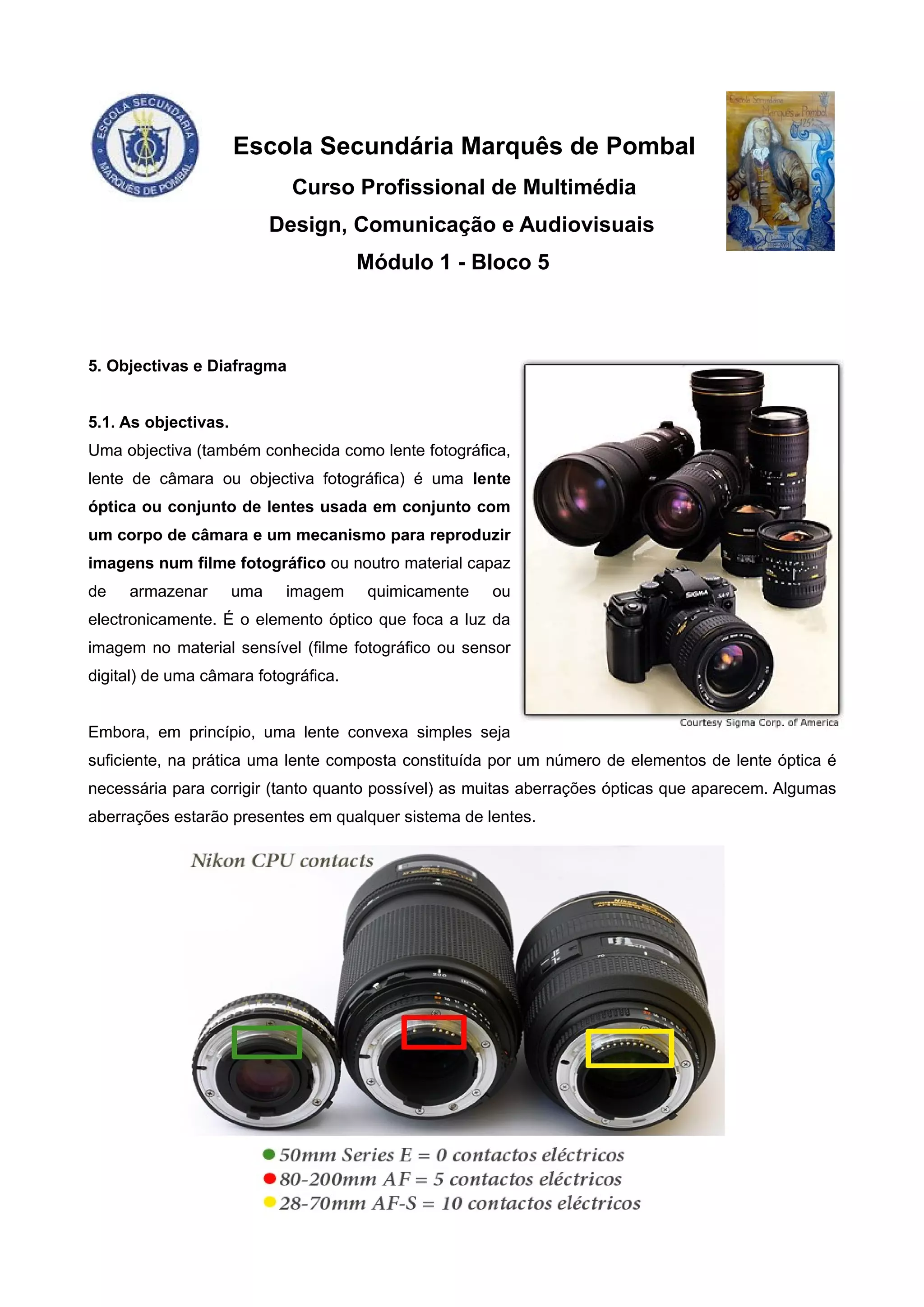 Este documento discute as lentes e diafragmas das câmaras fotográficas. As lentes (também chamadas de objetivas) focam a luz na câmara e podem ser fixas ou intercambiáveis. O diafragma controla a quantidade de luz que passa através da lente e é medido em números f. Diafragmas mais abertos permitem mais luz mas diminuem a profundidade de campo, enquanto diafragmas mais fechados permitem menos luz mas aumentam a profundidade de campo.