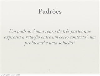 O documento discute os princípios e padrões do Domain Driven Design (DDD). Apresenta o que é DDD, seu foco no domínio do negócio, e alguns de seus blocos de construção como entidades, agregados, serviços, módulos e repositórios. Também discute técnicas como refatoração, linguagem ubíqua e integração contínua para implementar corretamente o DDD.