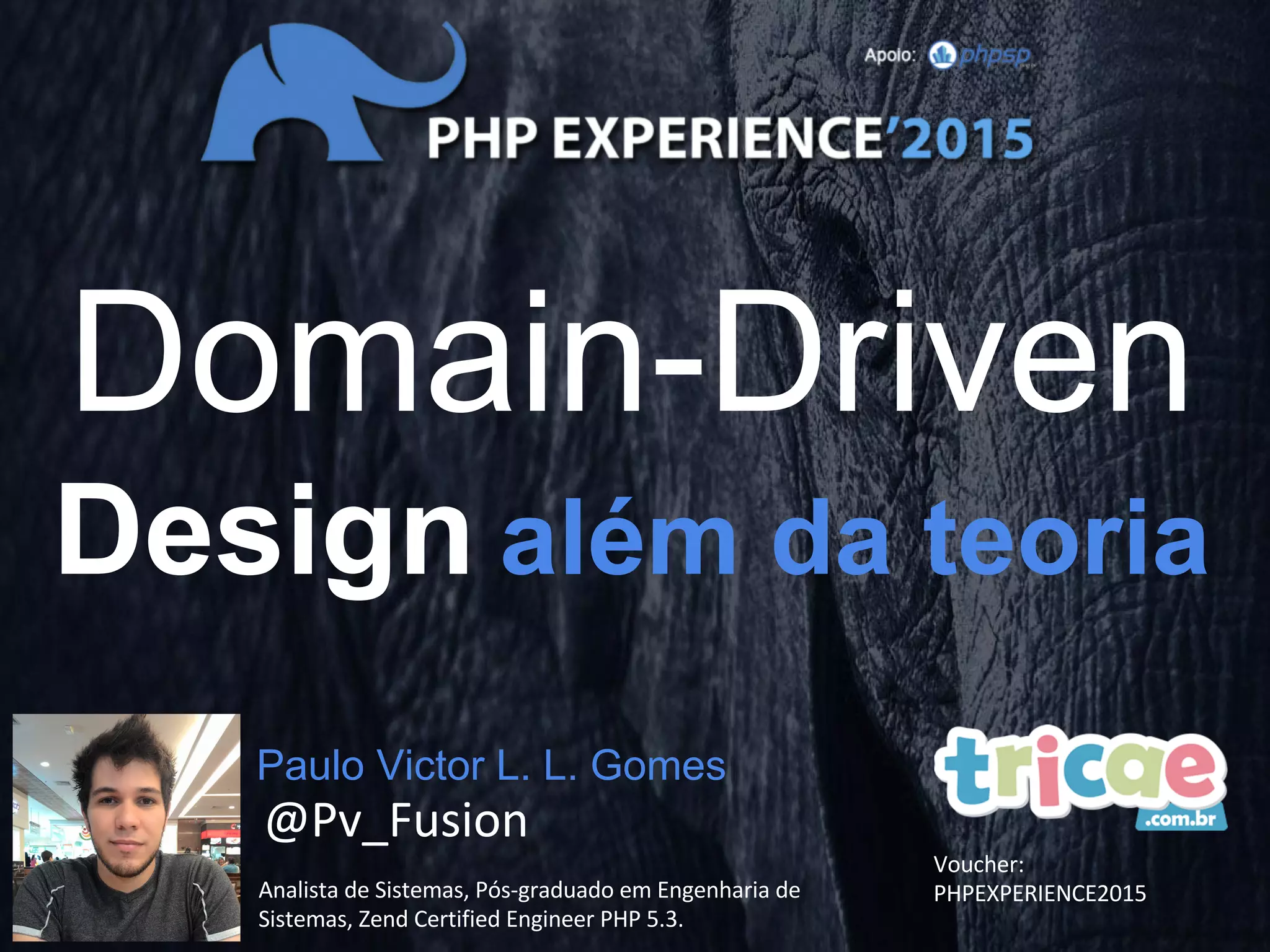 O documento discute Domain-Driven Design (DDD), abordando conceitos como linguagem ubíqua, modelagem orientada a domínio, blocos de construção como entidades e objetos de valor. Exemplifica como esses conceitos podem ser aplicados na prática ao modelar uma camada de domínio com classes como Product, Currency e Money.