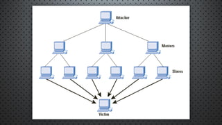 O documento descreve o que é um ataque DDoS, como ele funciona e como se prevenir. Um ataque DDoS tem como objetivo sobrecarregar os recursos de um sistema para torná-lo indisponível aos usuários, de forma análoga ao que ocorre com as companhias telefônicas no Ano Novo. O ataque envolve um atacante, máquinas mestre e agentes que executam o ataque, e uma vítima.