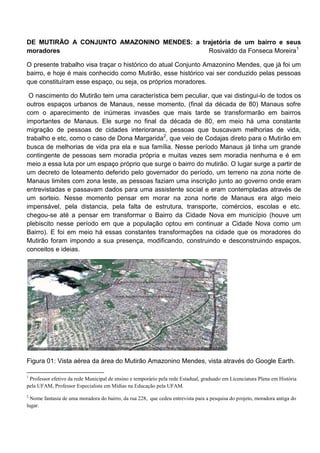 O documento descreve o histórico do bairro Mutirão Amazonino Mendes em Manaus, que surgiu no final da década de 1980 como uma invasão em meio à migração de pessoas de cidades do interior em busca de melhores condições de vida. O bairro começou com um decreto de loteamento do governo e as pessoas faziam inscrição e sorteio para obter terrenos. Apesar de inicialmente estar distante dos serviços da cidade, os moradores foram construindo o espaço ao longo do tempo.