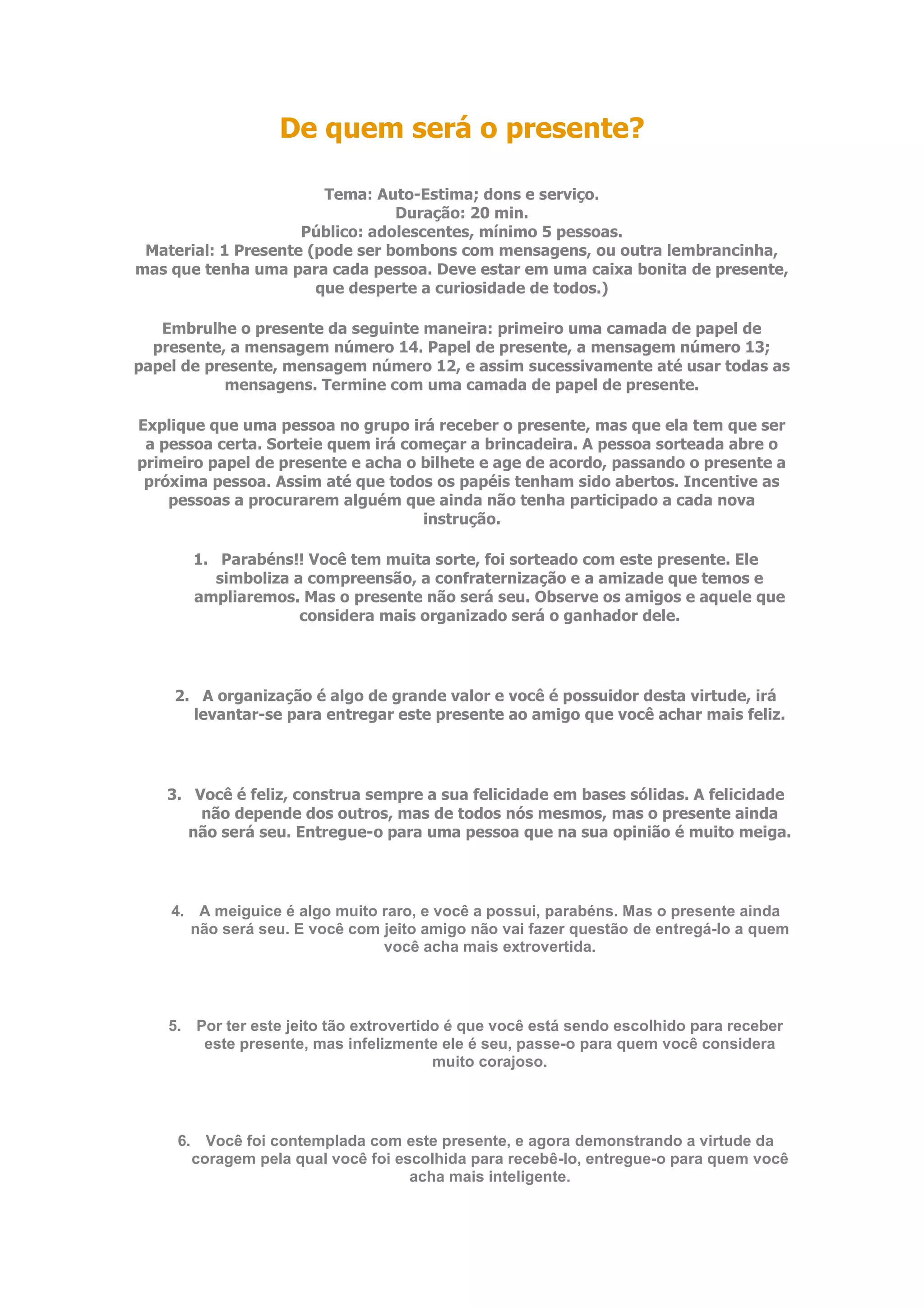 1) Os adolescentes devem passar um presente de mão em mão seguindo instruções em bilhetes dentro do embrulho, escolhendo quem tem qualidades como organização, felicidade, meiguice, etc.