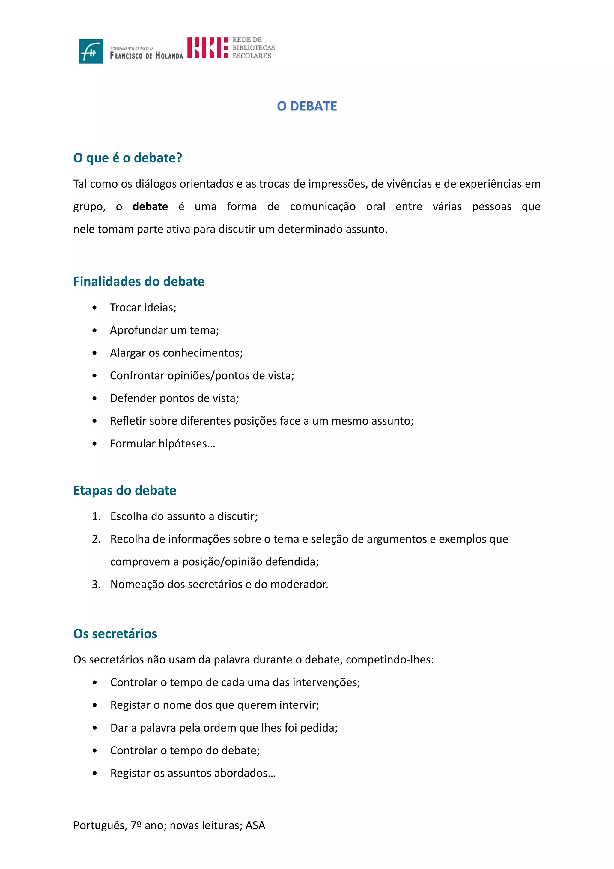 O documento descreve o que é um debate, suas finalidades e etapas. Um debate envolve a discussão de um assunto por várias pessoas que trocam ideias e pontos de vista. Os participantes devem respeitar regras como ouvir uns aos outros e falar de forma ordenada sob a mediação de um moderador.