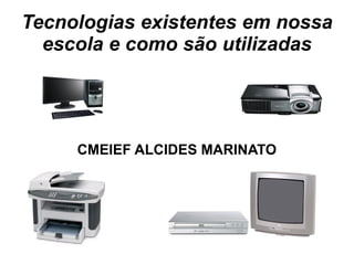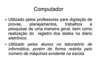 O documento descreve as tecnologias existentes na escola e como são utilizadas, incluindo computadores para trabalho dos professores e alunos, projetor multimídia para aulas e apresentações, impressora multifuncional para atividades impressas, e televisão/DVD substituídos pelo projetor. Conclui que essas ferramentas são essenciais para proporcionar aprendizado satisfatório aos alunos, com o professor como mediador da aprendizagem.