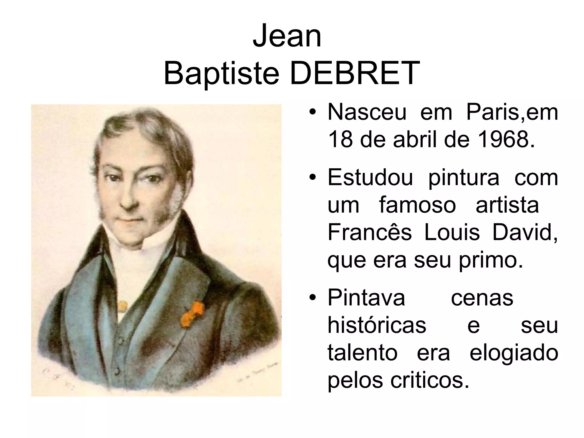 Jean Baptiste Debret nasceu em Paris em 18 de abril de 1768 e se destacou como pintor de cenas históricas. Após a morte de seu filho, decidiu se mudar para o Brasil, onde se tornou um dos primeiros artistas a retratar a nobreza e a vida cotidiana brasileira. Debret também foi responsável pela criação da bandeira do Brasil durante o Império e faleceu em 1848 em Paris.