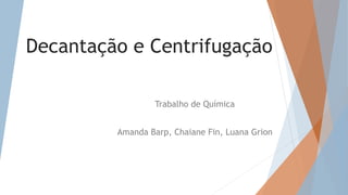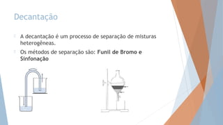 O documento descreve métodos de separação de misturas heterogêneas como decantação, funil de bromo, sinfonação e centrifugação. A decantação separa misturas deixando-as em repouso para que a parte mais densa se separe da menos densa. O funil de bromo e a sinfonação transferem cuidadosamente a parte líquida menos densa. A centrifugação acelera a sedimentação fazendo com que as partículas mais densas se depositem no fundo do tubo de ensaio.