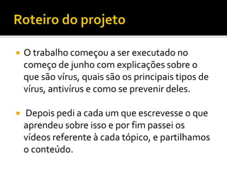 O documento descreve um projeto sobre o uso de TICs na educação que ensinou estudantes sobre vírus de computador, incluindo os principais tipos de vírus, como eles funcionam e como se prevenir, mostrando vídeos sobre o tema e recebendo feedback positivo dos alunos.