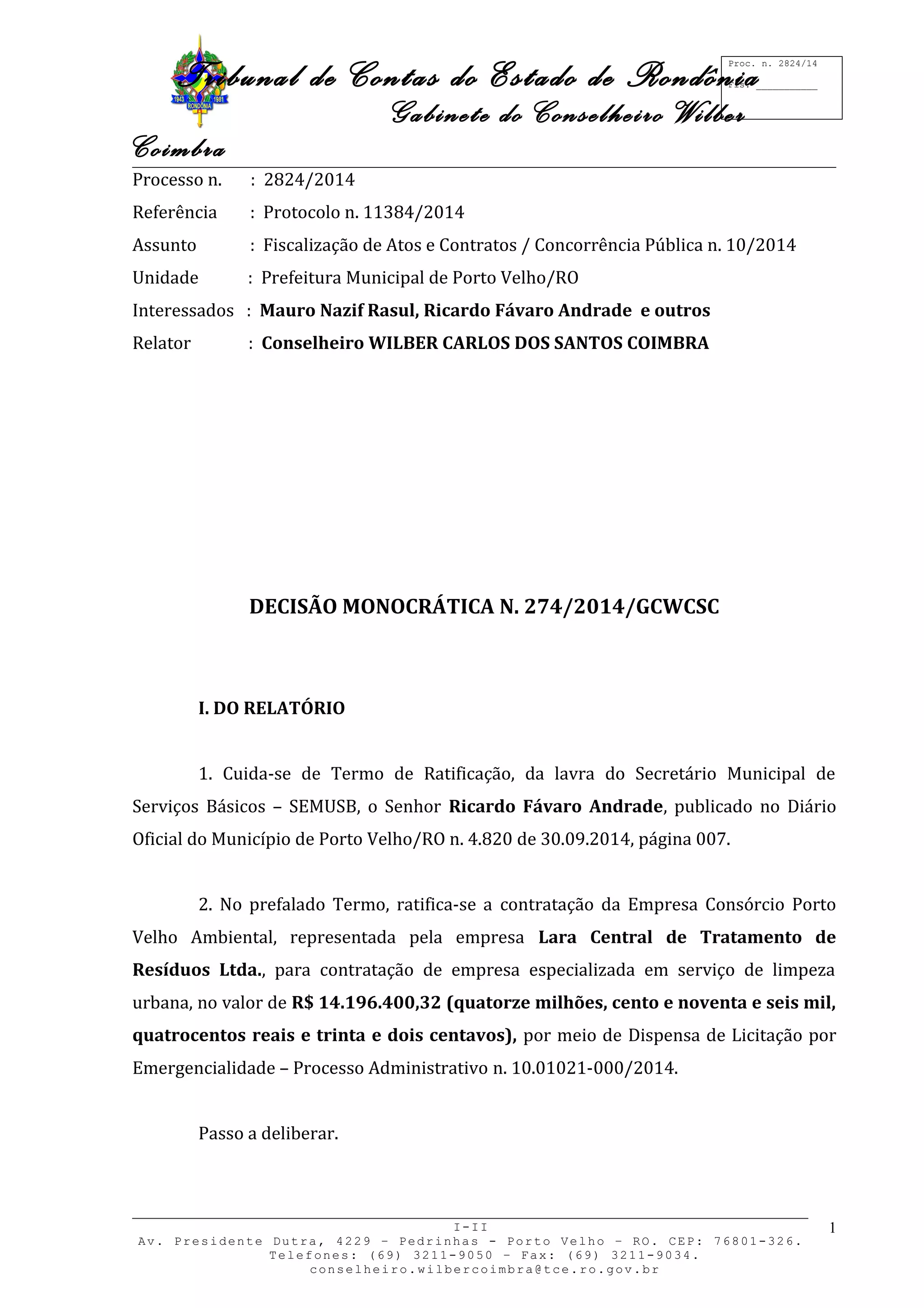 O Tribunal de Contas do Estado de Rondônia está investigando irregularidades em uma licitação da Prefeitura Municipal de Porto Velho para serviços de limpeza urbana. Jornais locais previram que a empresa Lara Central de Tratamento de Resíduos Ltda. venceria a licitação. A prefeitura então contratou a empresa de forma emergencial sem licitação, sob suspeita de irregularidades. O Tribunal determinou uma inspeção para investigar o processo de dispensa de licitação.