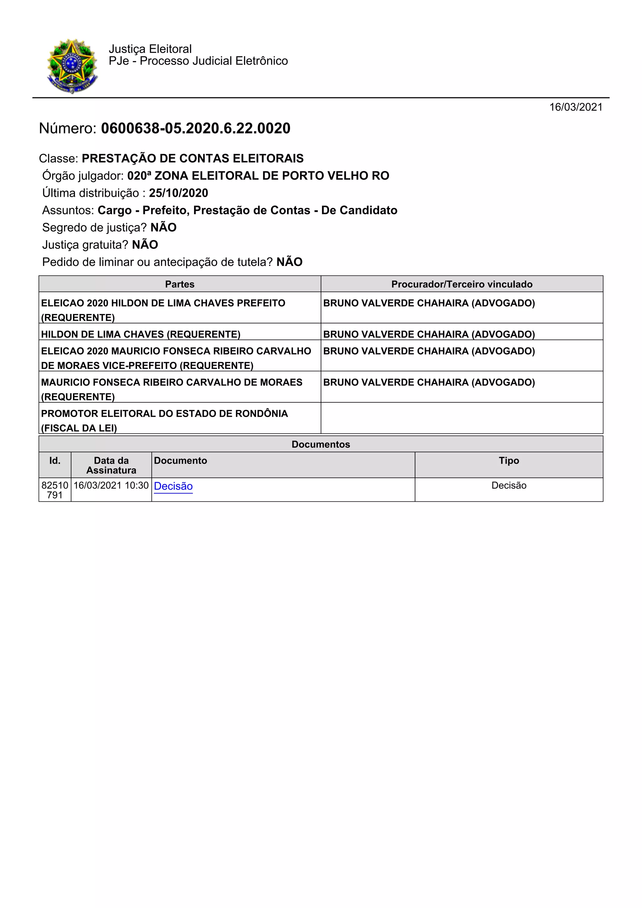 O documento trata da decisão judicial sobre os embargos de declaração apresentados por Hildon de Lima Chaves, prefeito de Porto Velho, visando esclarecer pontos da sentença que desaprovou suas contas eleitorais de 2020. A decisão final reconheceu algumas inconsistências nas contas, mas aprovou-as com ressalvas, destacando a aplicação de princípios de razoabilidade e proporcionalidade em relação às irregularidades encontradas. As contas foram, portanto, consideradas aprovadas, com a imposição de recolhimento de valores ao tesouro nacional.