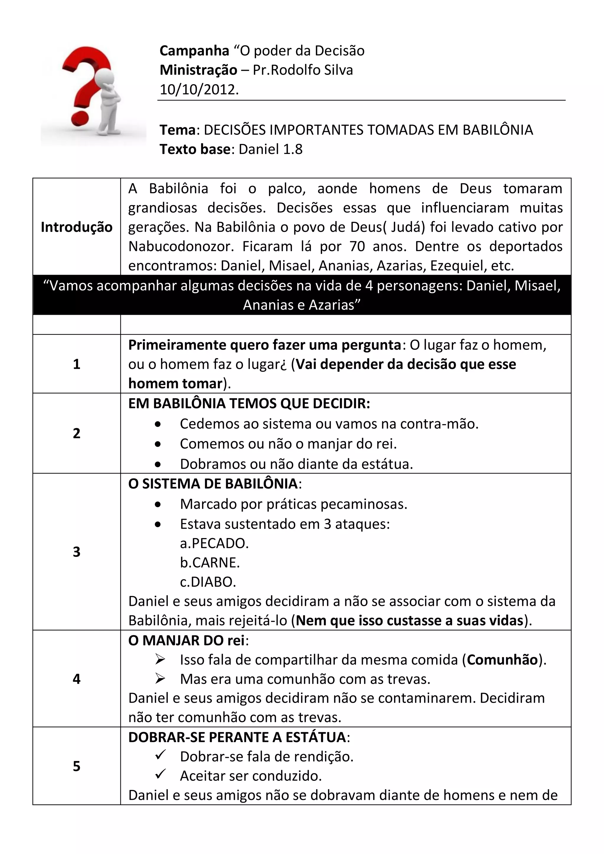 Daniel e seus amigos Ananias, Azarias e Misael tomaram decisões importantes em Babilônia que influenciaram gerações, recusando-se a desobedecer a Deus ao se recusarem a comer a comida do rei, curvarem-se diante da estátua do rei ou se associarem com os pecaminosos sistemas de Babilônia.