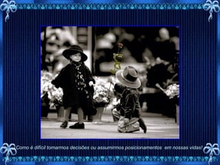 O documento discute as dificuldades em tomar decisões e assumir posicionamentos na vida. Também aborda como fomos condicionados a aceitar ideias impostas e como é difícil exercitar o pensamento crítico e raciocínio próprio. No entanto, ao encontrarmos coragem para um novo começo, poderemos descobrir nossa capacidade de enfrentar os problemas e trilhar nosso próprio caminho com liberdade e certeza.