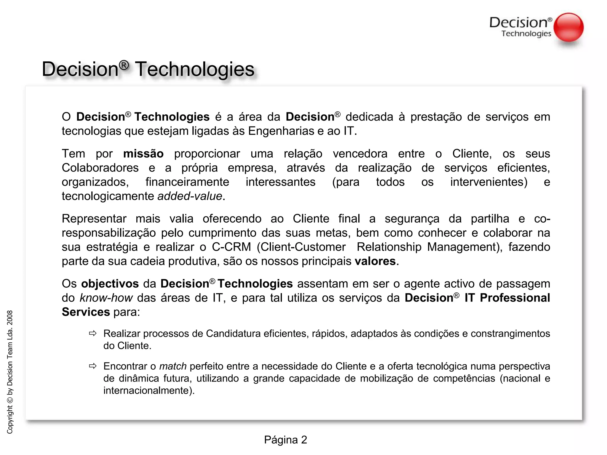 O documento descreve os serviços de tecnologia da informação oferecidos pela Decision® Technologies, incluindo uma variedade de habilidades técnicas e metodologias em diferentes áreas como desenvolvimento de software, bancos de dados, sistemas operacionais e administração. A empresa visa fornecer profissionais qualificados para complementar a capacidade técnica dos clientes e apoiar seus objetivos de negócios.