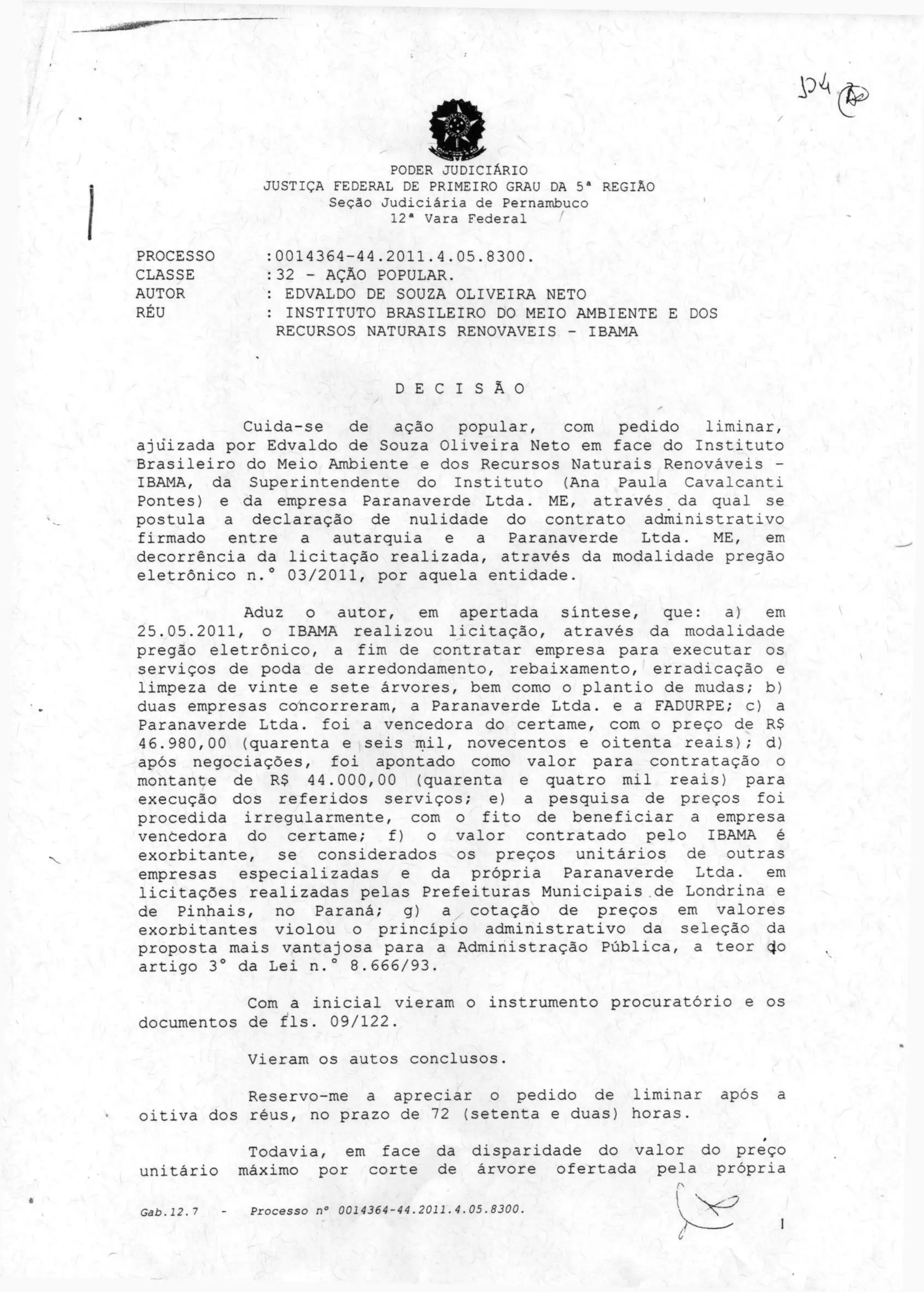 Este documento é uma decisão judicial em uma ação popular que questiona o contrato entre o IBAMA e a empresa Paranaverde para serviços de poda de árvores. O juiz suspendeu o pagamento do contrato até decisão final, dada a grande diferença de preços em relação a outros contratos da mesma empresa e de outra empresa para a administração pública. O IBAMA e a Paranaverde deverão ser citados.