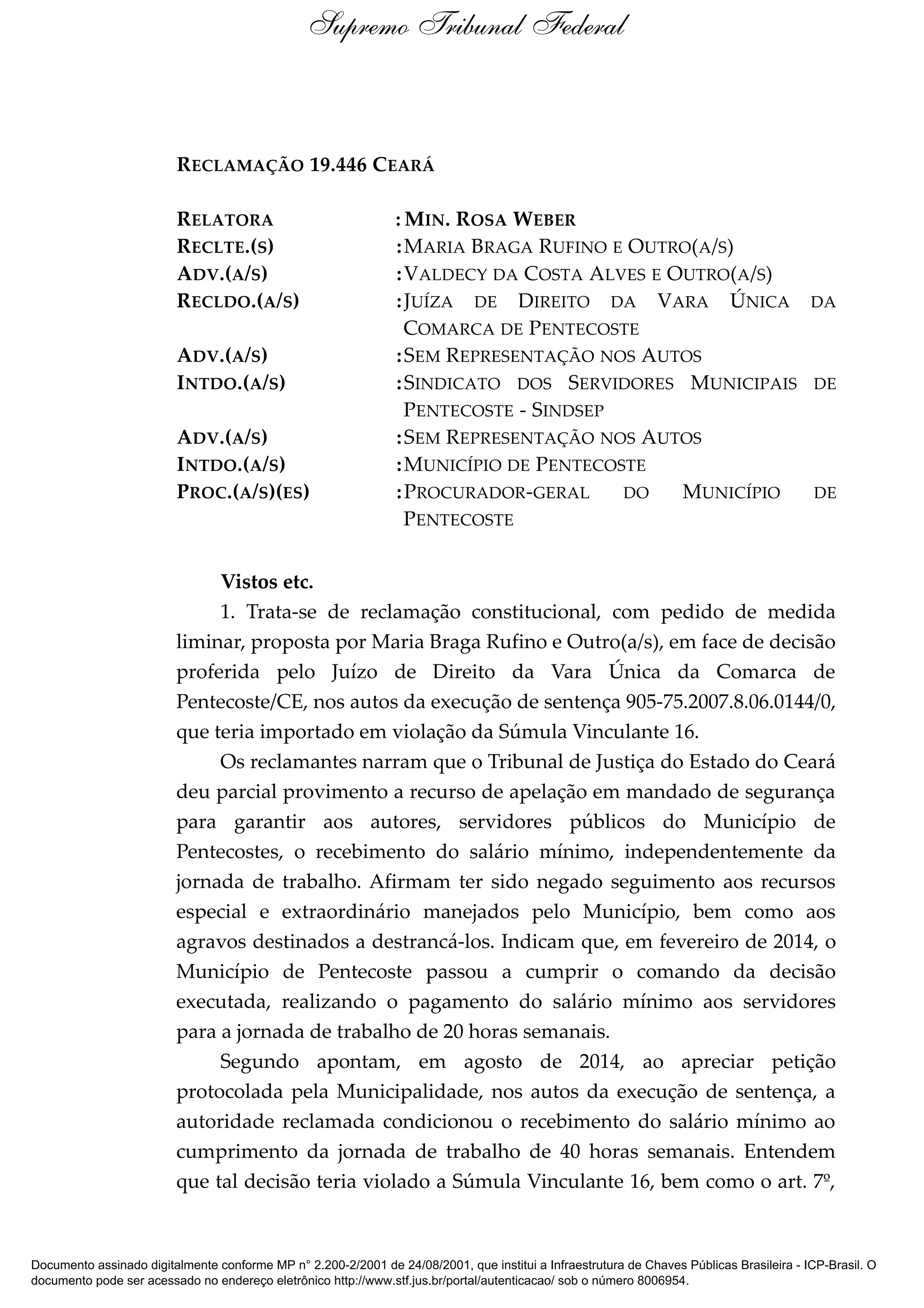 O documento trata de uma reclamação constitucional proposta por servidores públicos municipais contra decisão judicial que condicionou o recebimento do salário mínimo à carga horária de 40 horas semanais. A ministra relatora negou seguimento à reclamação por entender que a decisão questionada não contrariou estritamente a Súmula Vinculante 16, que garante o salário mínimo sobre o total da remuneração.