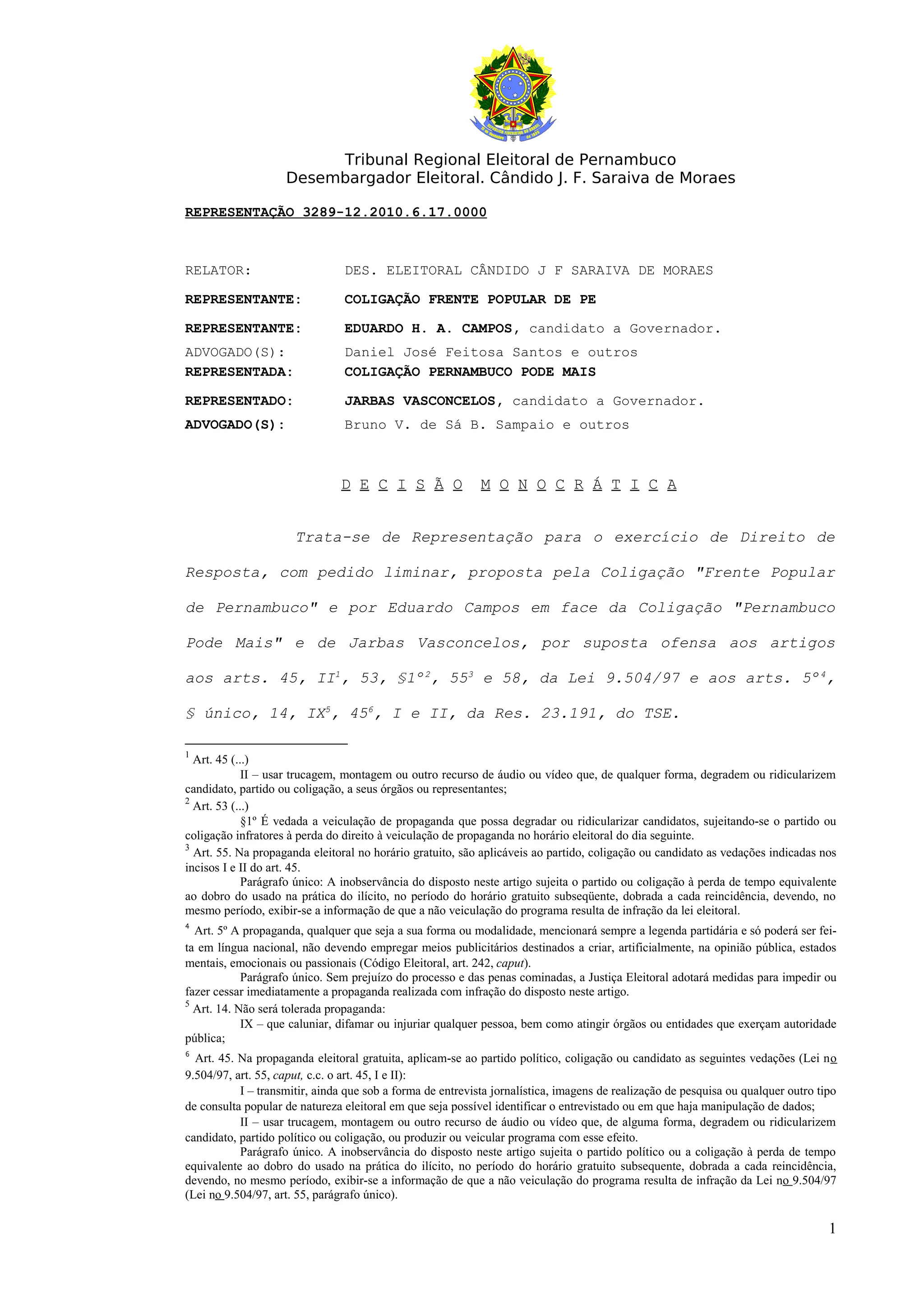 Este documento trata de uma representação movida pela coligação "Frente Popular de Pernambuco" contra a coligação "Pernambuco Pode Mais" alegando propaganda eleitoral difamatória. A representação pede direito de resposta e perda de tempo de propaganda. O relator analisa o caso e conclui que não há provas de difamação, mas a coligação representada não comprovou a veracidade de certas afirmações feitas na propaganda questionada.
