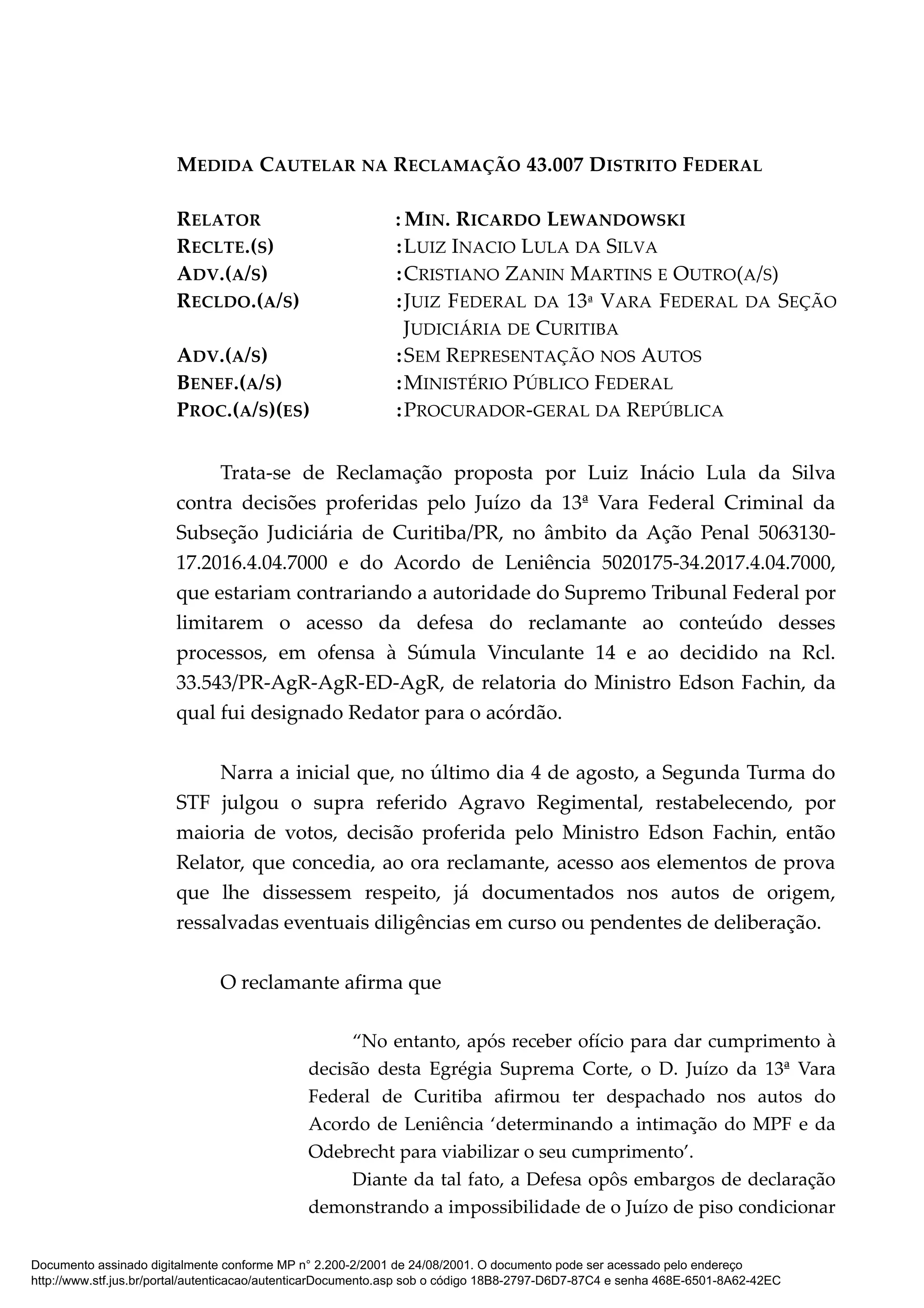 Trata-se de uma reclamação proposta por Lula contra decisões da 13a Vara Federal de Curitiba que condicionaram o acesso da defesa ao conteúdo do acordo de leniência da Odebrecht à seleção prévia pelo Ministério Público e pela empresa, contrariando decisão anterior do STF. O relator reconhece que a reclamação atende aos requisitos formais e que a decisão reclamada parece descumprir o julgamento invocado como precedente.