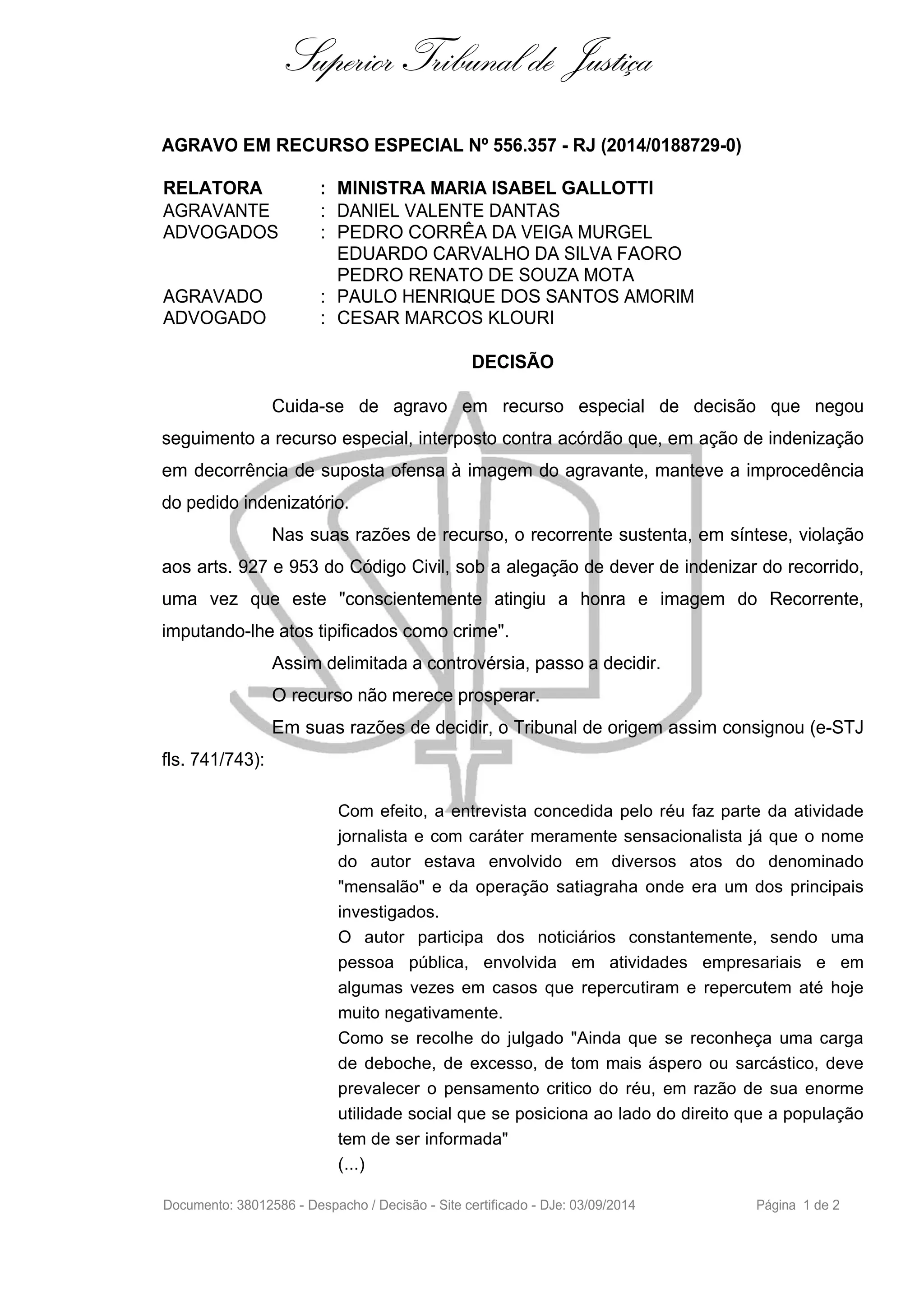 O Tribunal negou o recurso especial interposto contra decisão que manteve a improcedência de pedido indenizatório em ação por suposta ofensa à imagem. A Corte entendeu que a entrevista do réu, um jornalista, fazia parte da liberdade de imprensa e do direito de informar, tendo em vista envolver assunto de interesse público.