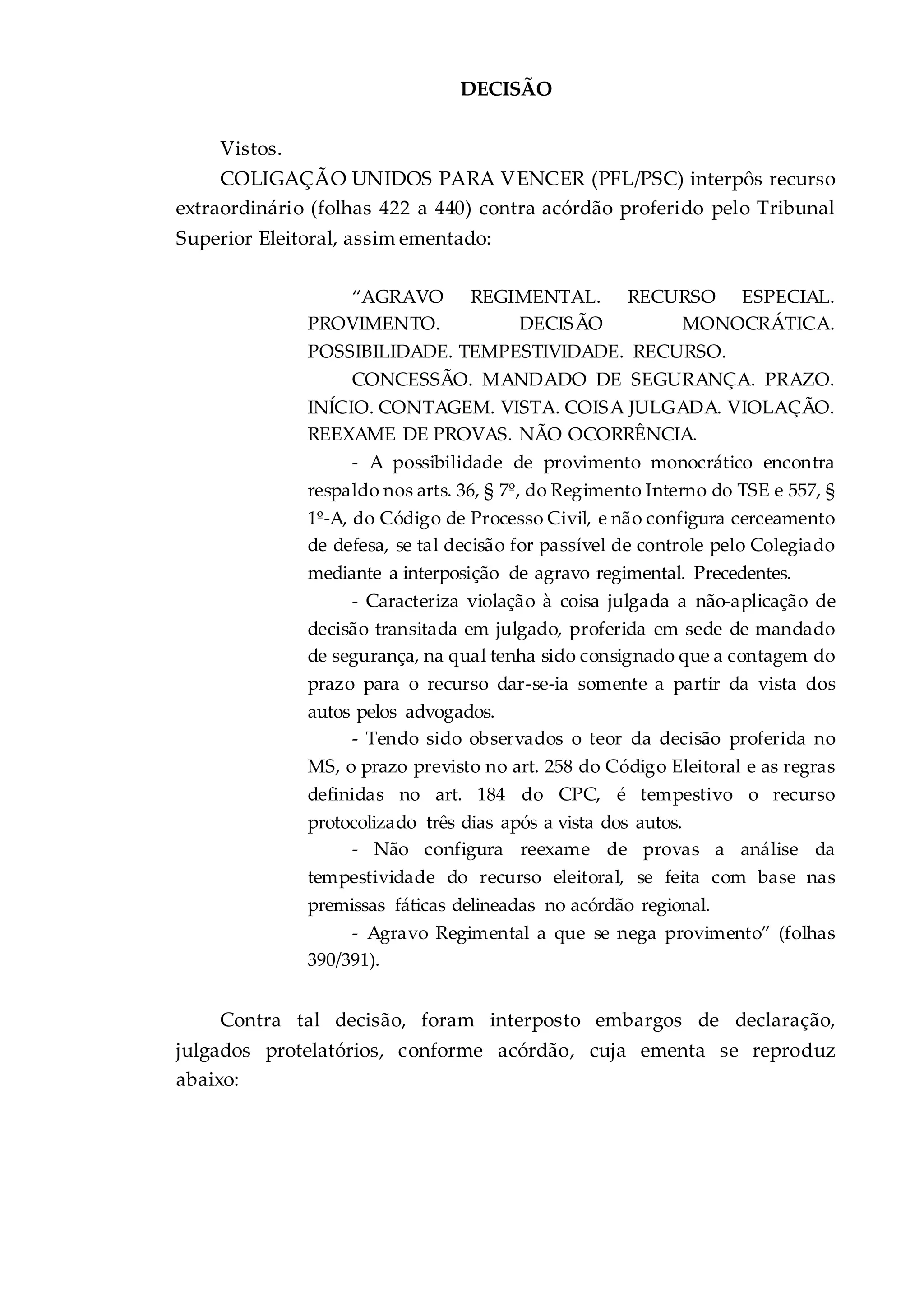 O Tribunal Superior Eleitoral julgou embargos de declaração como protelatórios e manteve decisão anterior. Agora, nega seguimento a recurso extraordinário por ser intempestivo, uma vez que embargos declaratórios protelatórios não suspendem prazo para recorrer.