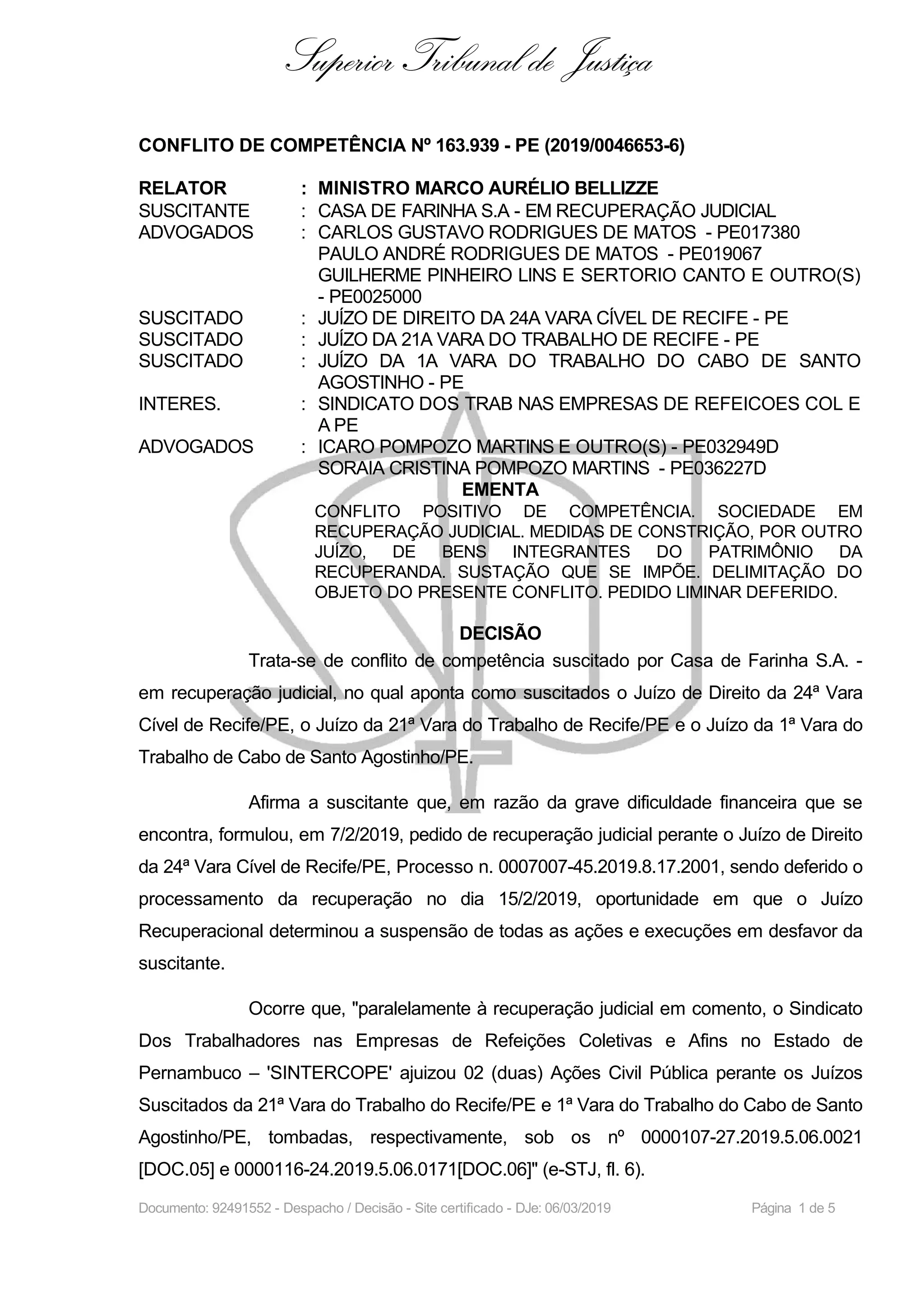 O documento relata um conflito de competência envolvendo a Casa de Farinha S.A., que está em recuperação judicial, e diversos juízos de trabalho em Pernambuco. A empresa solicita a suspensão de decisões que determinam a constrição de seus bens, argumentando que isso inviabiliza o seu processo de recuperação. O relator, Ministro Marco Aurélio Bellizze, deferiu uma liminar suspendendo a decisão que deferiu a tutela de urgência em um dos processos trabalhistas, determinando que a 24ª Vara Cível de Recife se encarregue das questões urgentes.