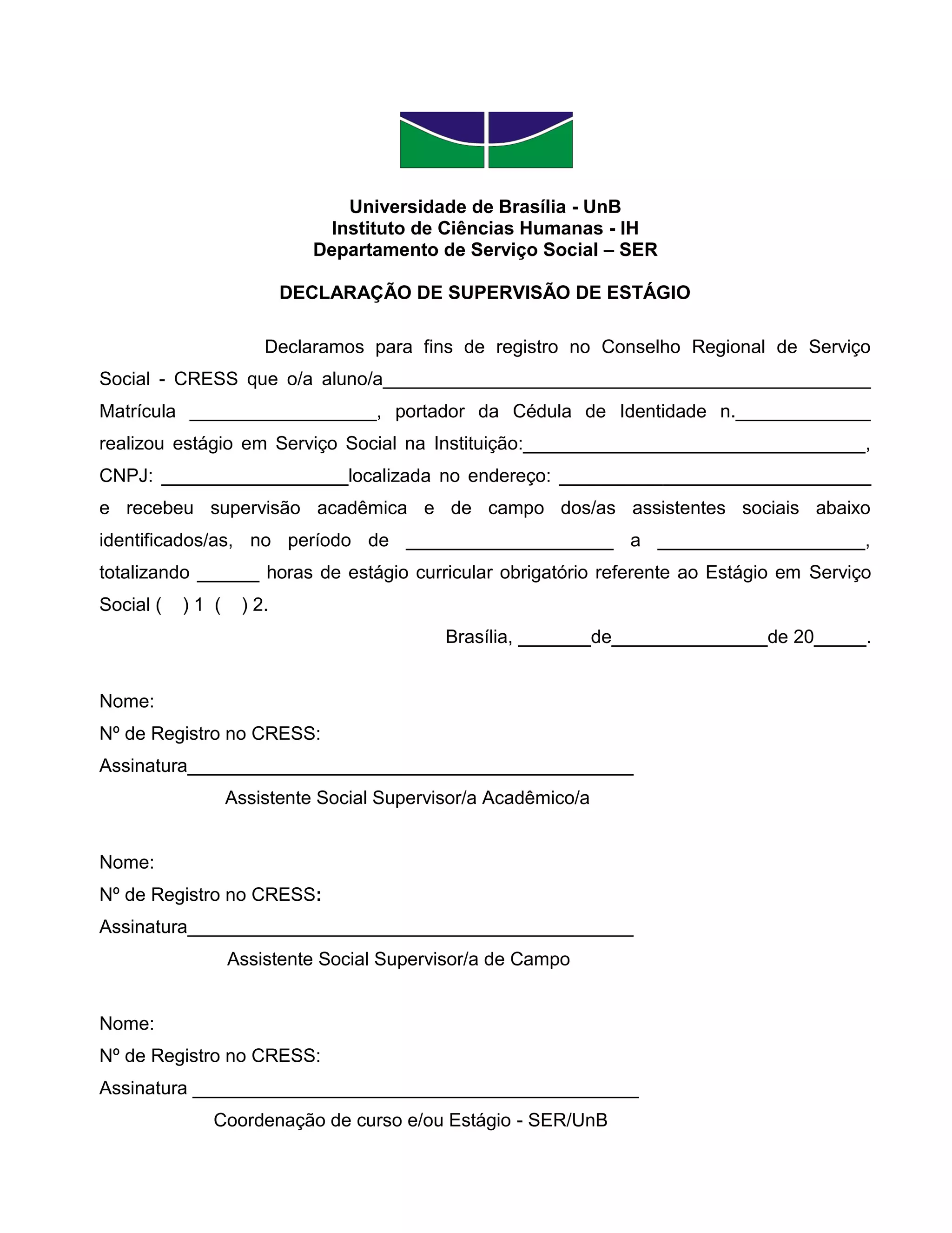 Este documento declara que um aluno realizou estágio obrigatório em serviço social em uma instituição específica, sob a supervisão de dois assistentes sociais, durante um período específico e totalizando um número de horas requerido. As assinaturas dos supervisores e da coordenação do curso confirmam a realização do estágio.