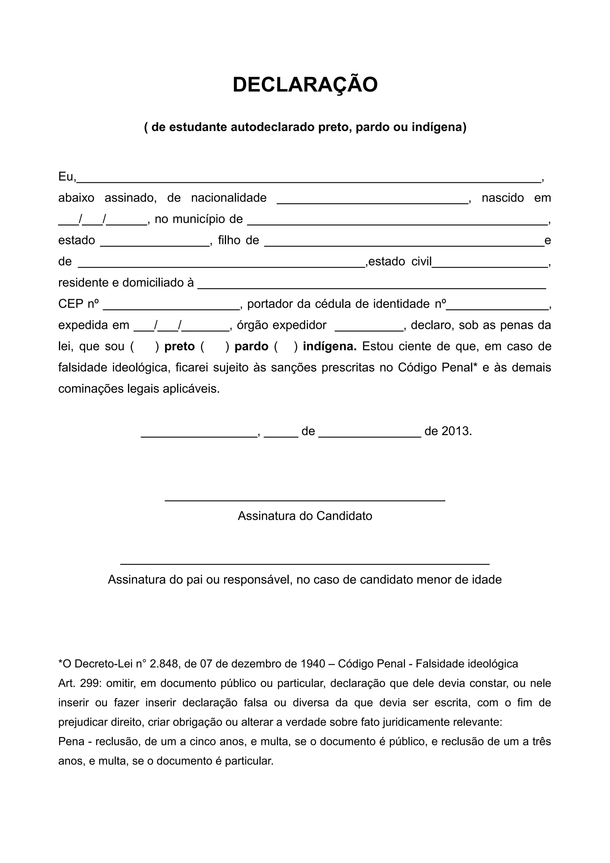 Este documento é uma declaração de autodeclaração de raça para fins de políticas de ação afirmativa. O estudante declara sua raça como preta, parda ou indígena e está ciente das penalidades legais por falsidade ideológica. O documento é assinado pelo estudante e, se menor de idade, também pelo pai ou responsável.
