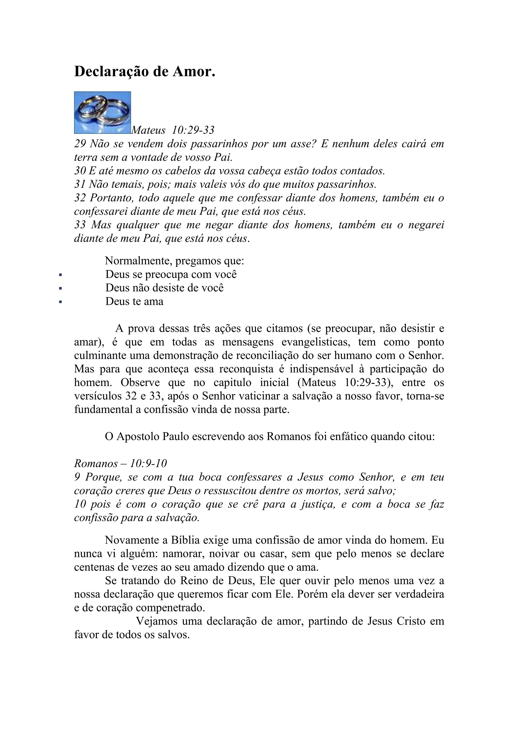 Este documento discute como Deus ama e se preocupa com os seres humanos, e como os seres humanos precisam confessar seu amor por Deus em retorno. Ele cita versículos bíblicos que mostram que Deus conta até os cabelos de nossas cabeças e não desiste de nós, e como precisamos confessar a Jesus como nosso Senhor para sermos salvos. Também inclui uma declaração de amor de Jesus por seus seguidores no Evangelho de João.