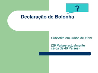 O documento descreve os objetivos da Declaração de Bolonha de 1999 para criar um Espaço Europeu de Ensino Superior através da mobilidade, qualidade e comparabilidade dos graus acadêmicos. Também define as competências gerais esperadas para educadores e professores do ensino básico e secundário em Portugal de acordo com documentos como o Decreto-Lei no 42/2005 e o parecer do Conselho Coordenador dos Institutos Superiores Politécnicos.