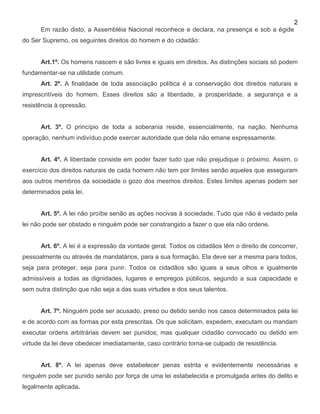 A Declaração de Direitos do Homem e do Cidadão de 1789 estabelece os direitos naturais e imprescritíveis do homem, como liberdade, segurança e resistência à opressão. Ela define que a soberania reside na nação e que todos são iguais perante a lei. A declaração também determina que ninguém pode ser punido sem um processo legal justo de acordo com as leis estabelecidas.