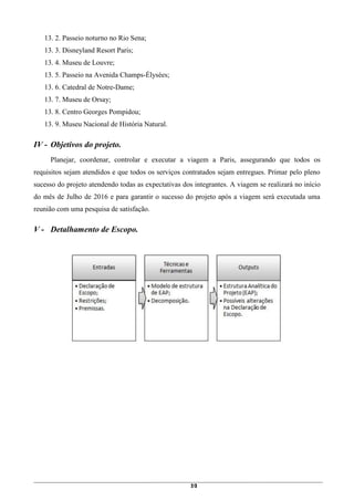 O documento descreve o escopo de um projeto de viagem em grupo a Paris, envolvendo seis pessoas. A viagem está planejada para julho de 2016 e inclui passagens, hospedagem, alimentação e atividades turísticas. O objetivo é garantir a execução bem-sucedida da viagem, atendendo às expectativas dos participantes.