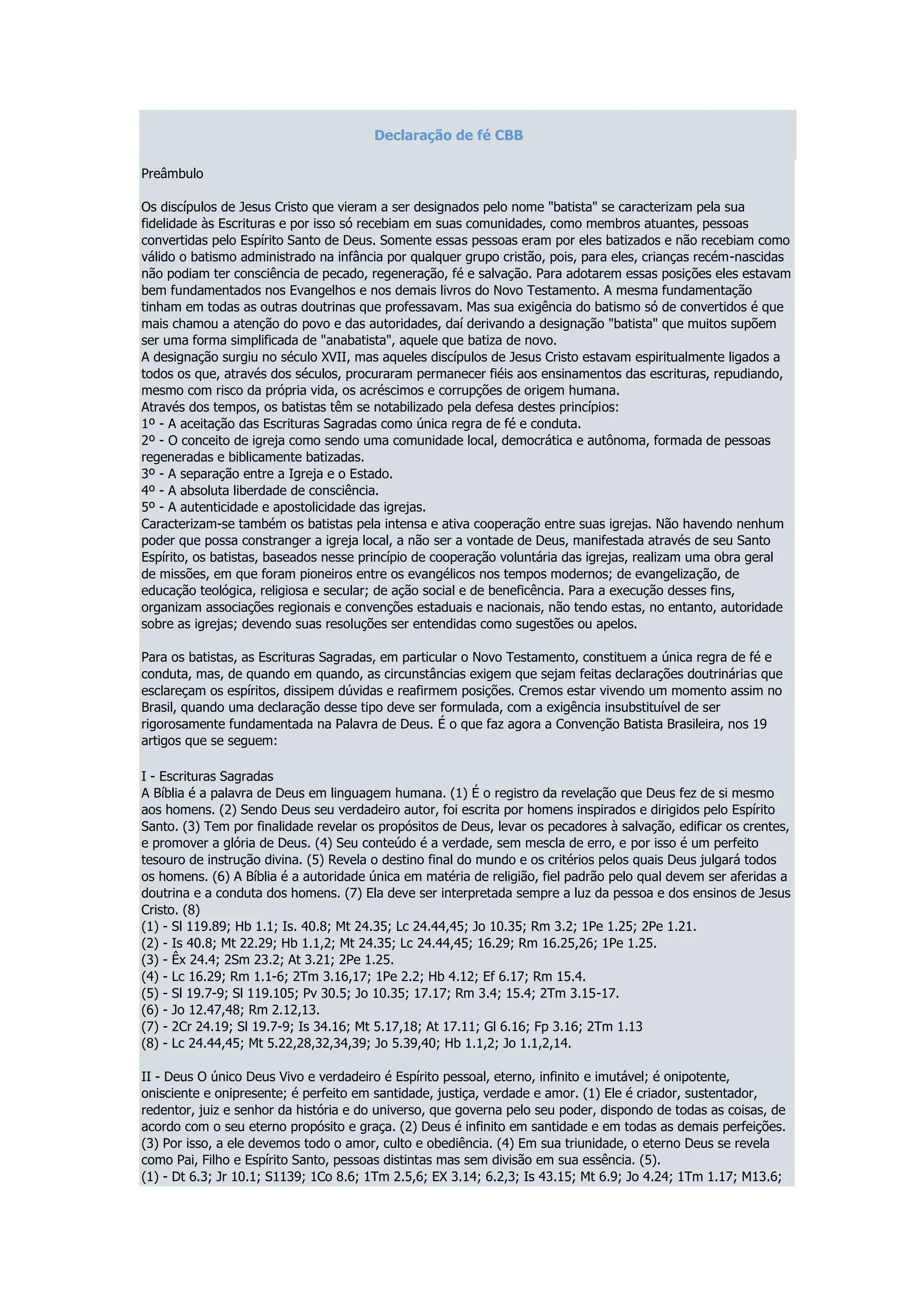 1) A declaração descreve a fé dos batistas e suas origens históricas, caracterizando-se pela fidelidade às Escrituras e batismo apenas de convertidos.